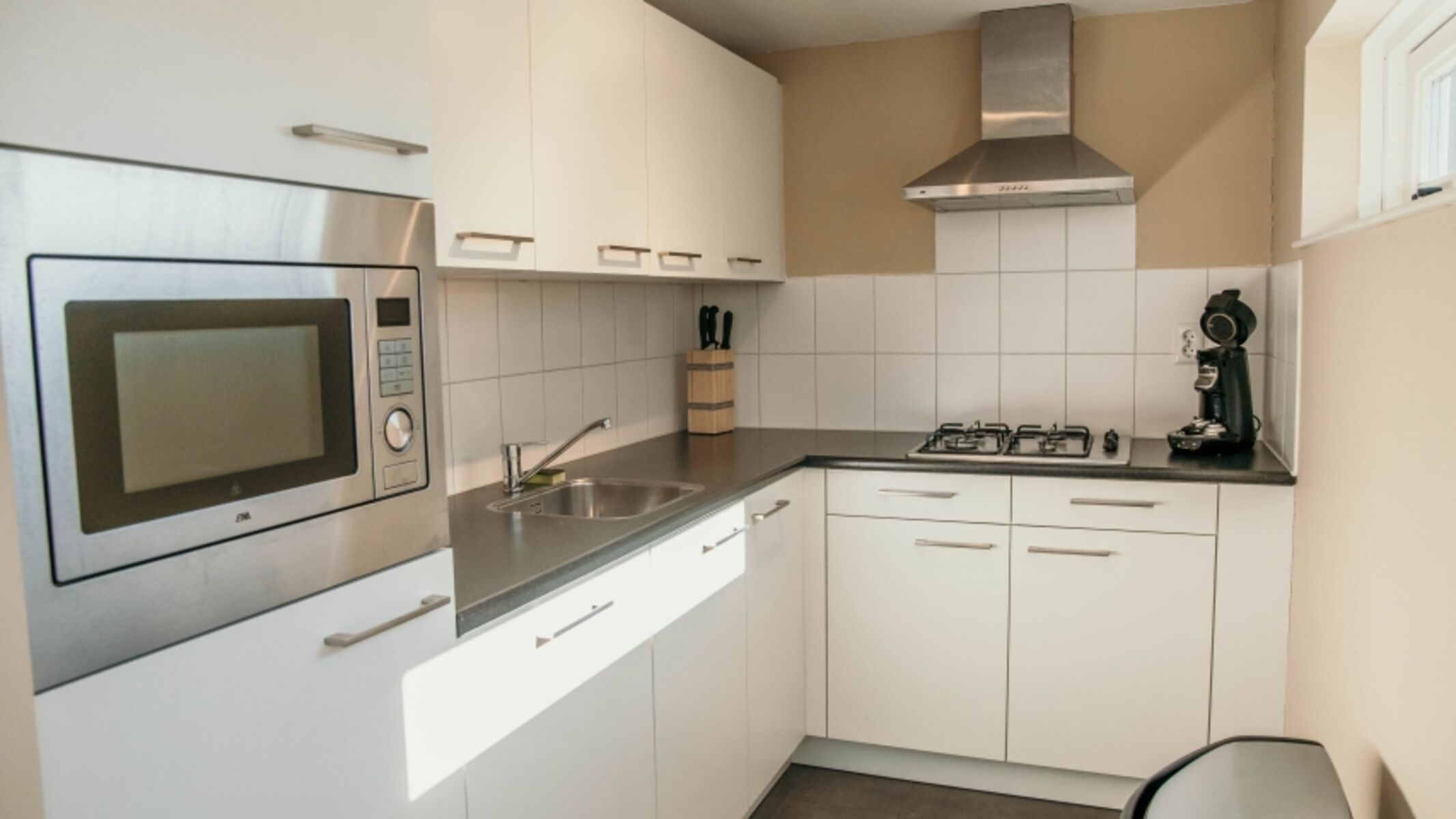 4-Platten Herd, Gasofen / Gasherd, Kühlschrank mit Gefrierfach, Senseo-Kaffeeautomat
