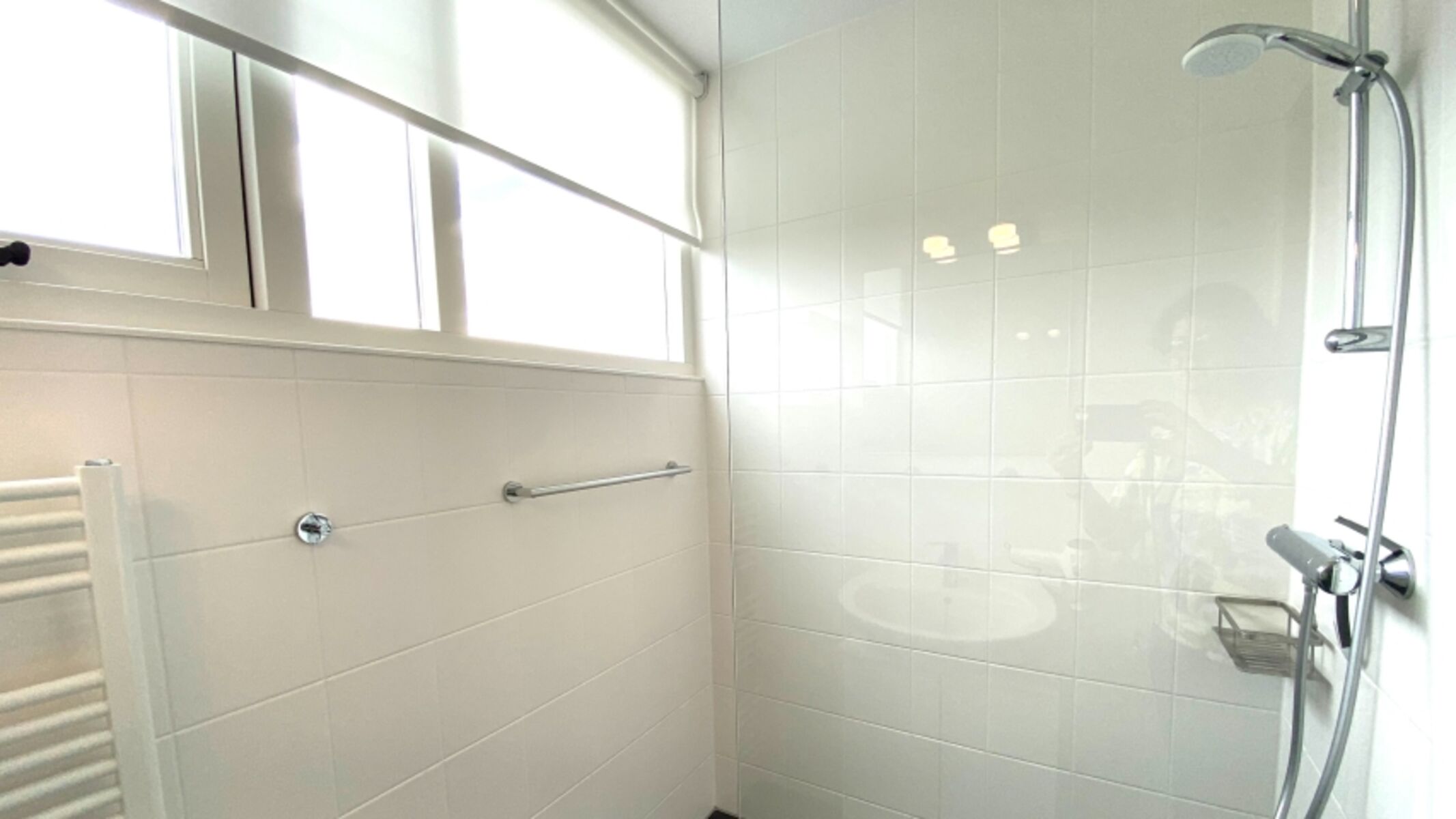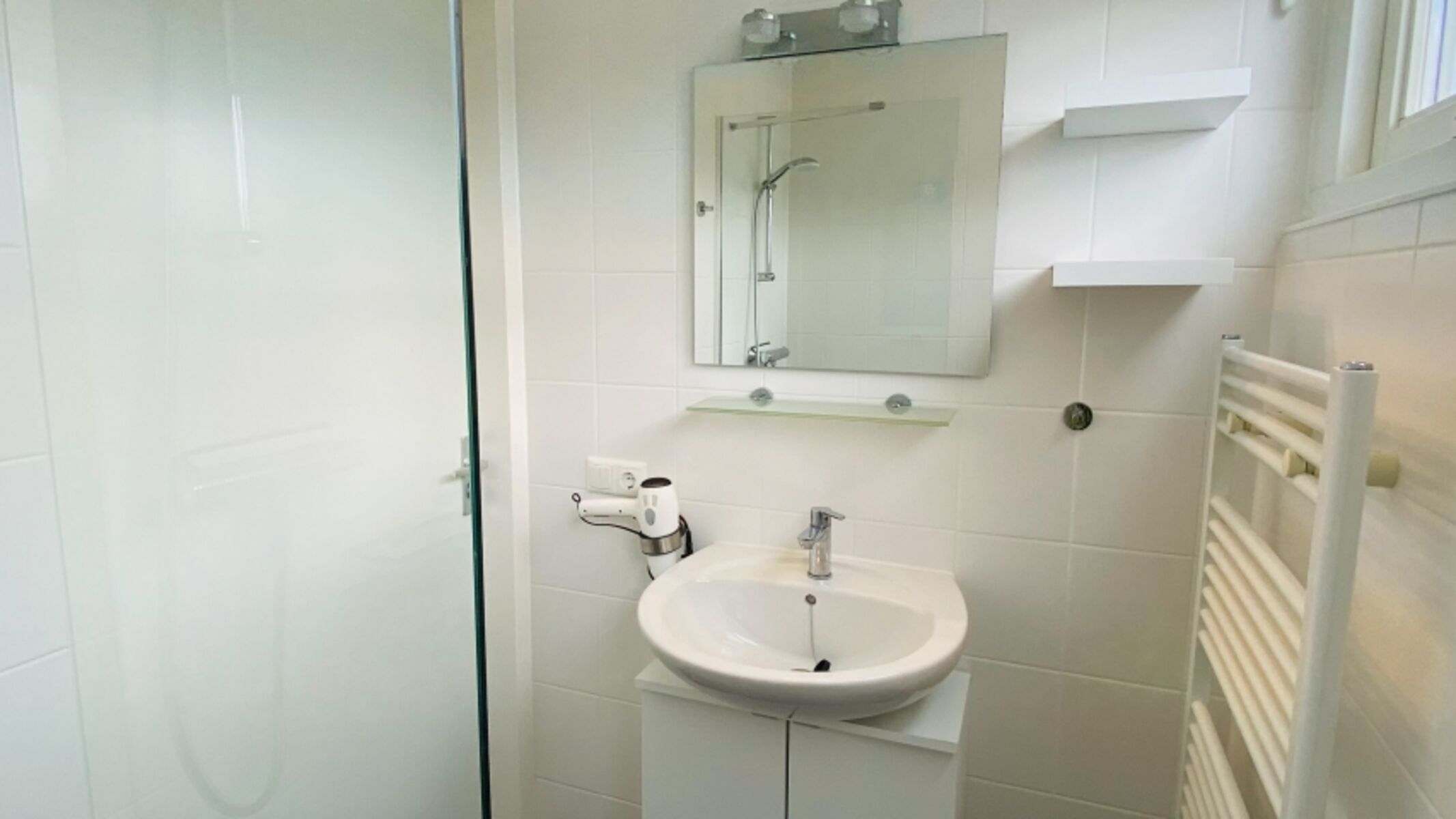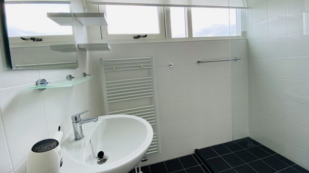 =Duche ensuite Fußbodenheizung Fliesenboden Waschbecken, Spiegel, Fenster im Bad