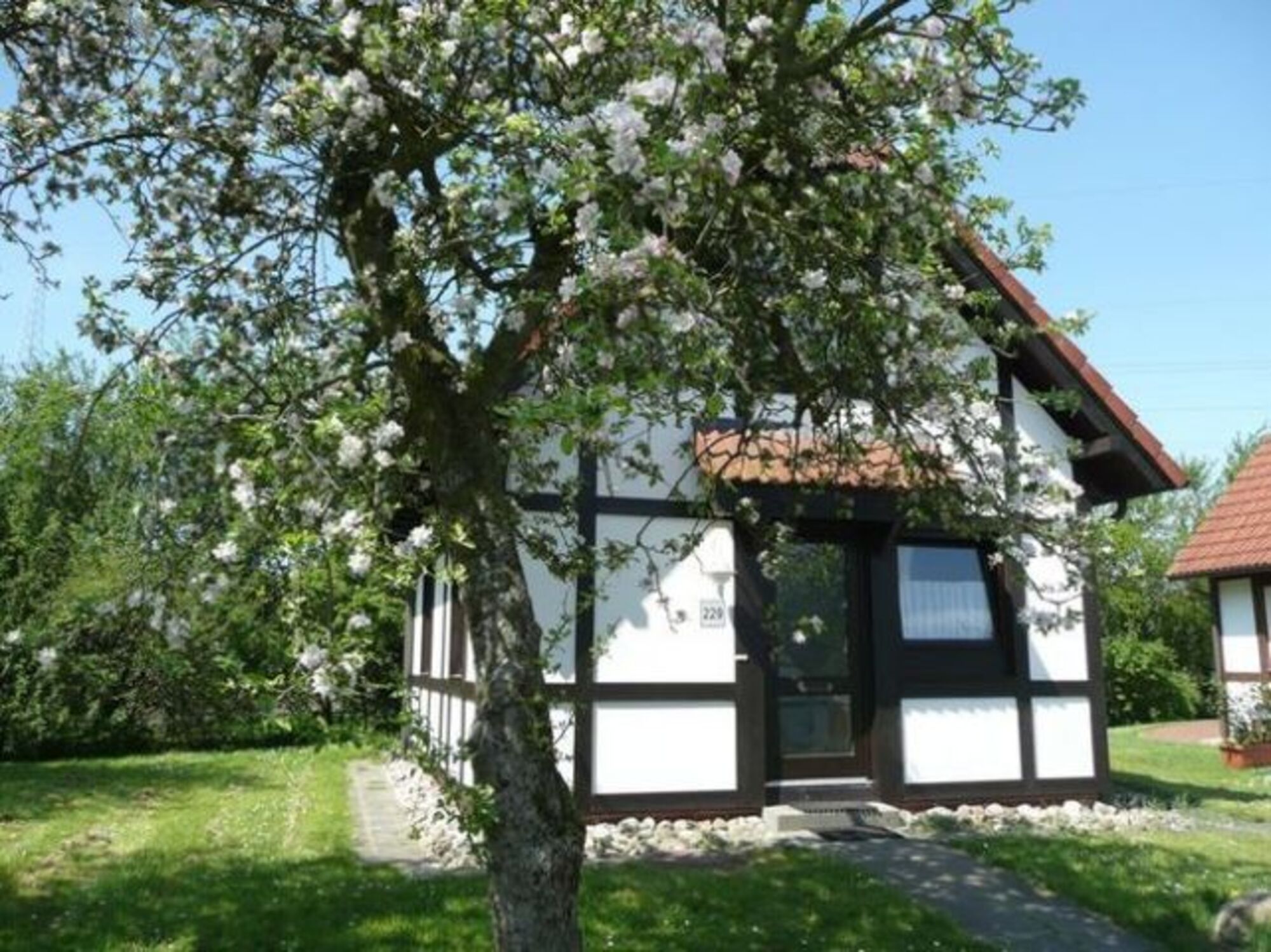 Im Feriendorf Altes Land, direkt am Elbdeich, zwischen Hamburg und Stade. Mitten in einem alten Obsthof, umgeben von tausenden im Frühjahr blühenden Obstbäumen, wartet dieses schöne Ferienhaus auf Sie.