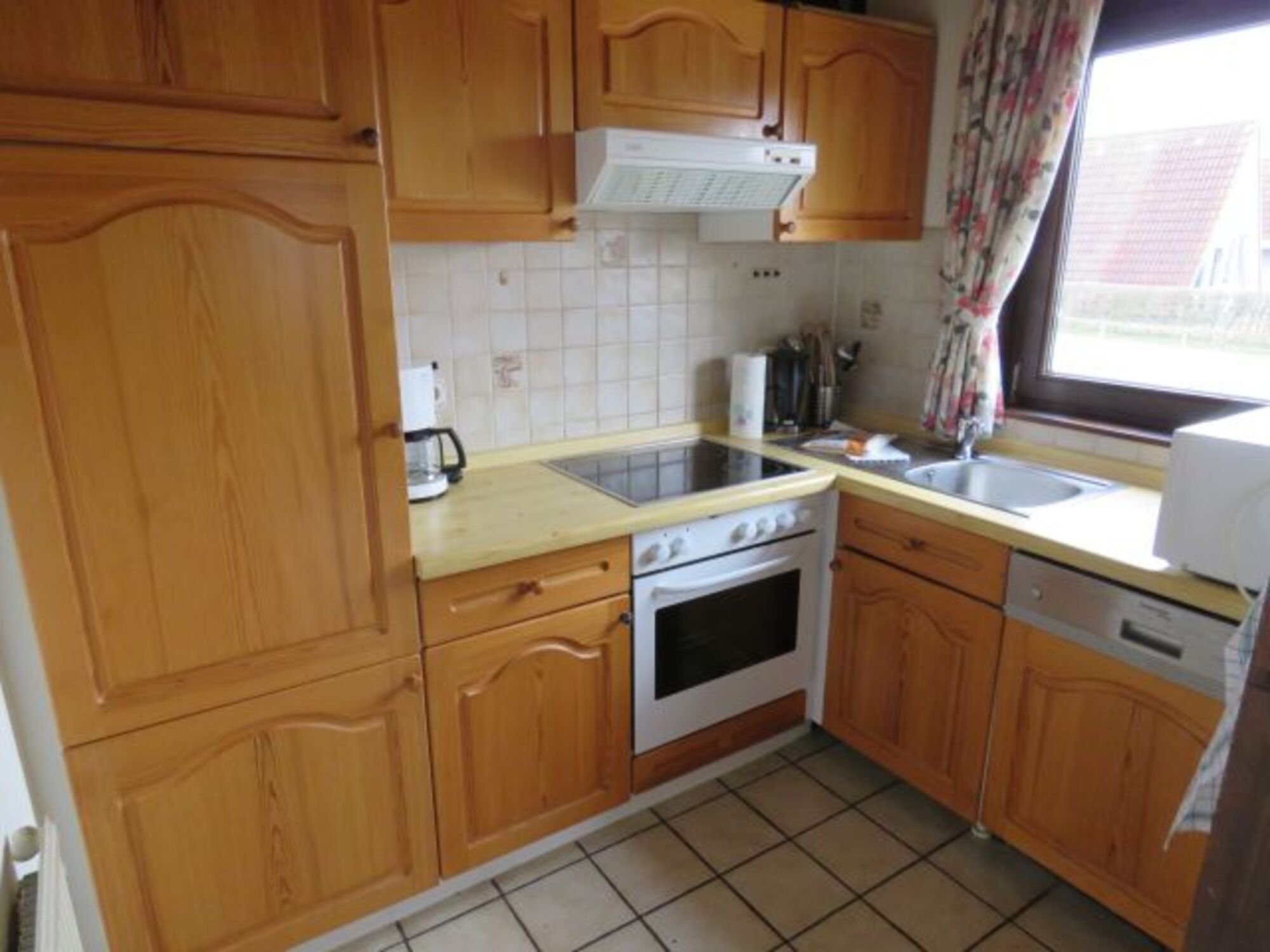 4-Platten Herd, Cerankochfeld, Dunstabzugshaube, Kühlschrank mit Gefrierfach, Korkenzieher / Flaschenöffner, Mülltüten