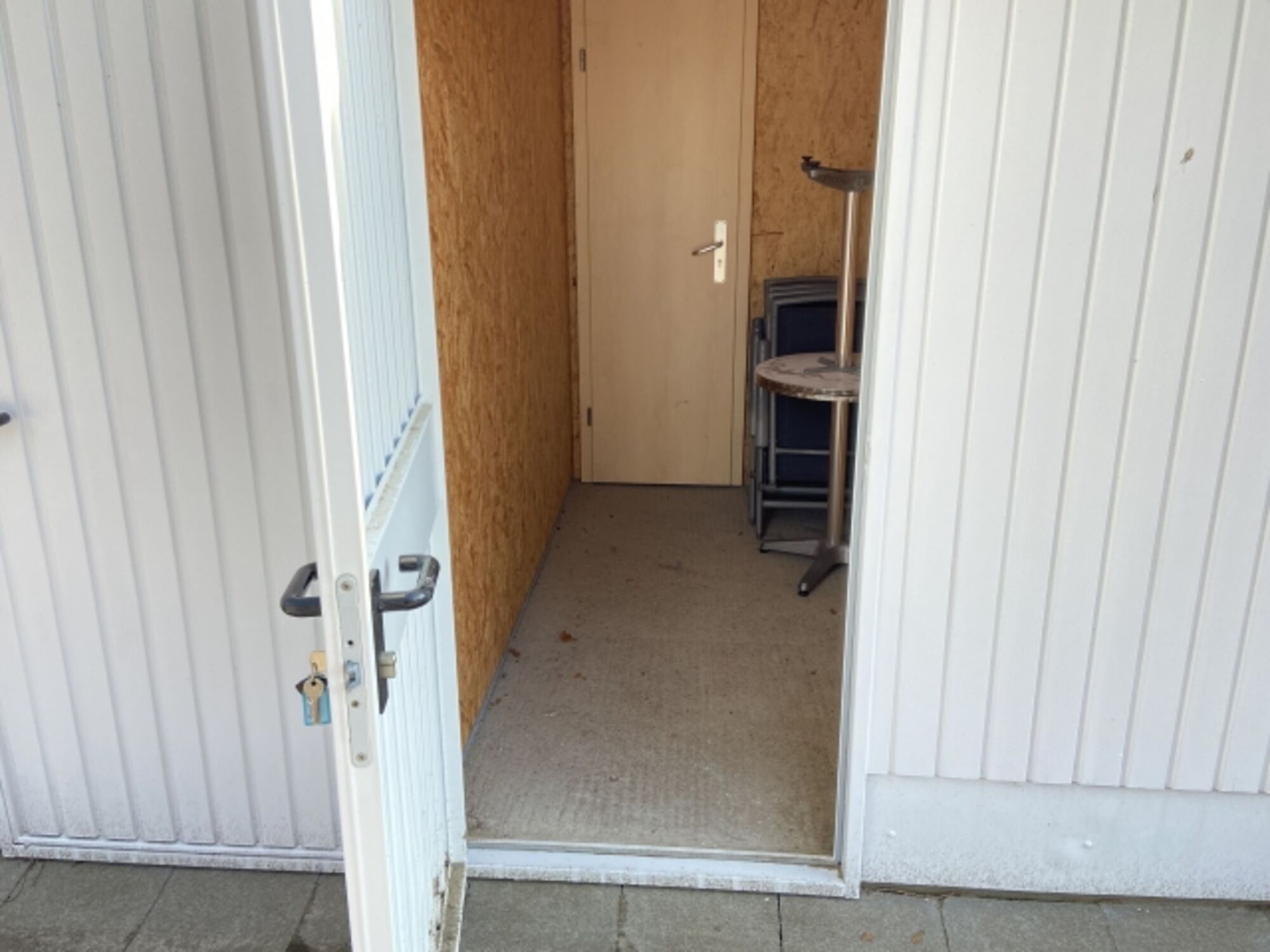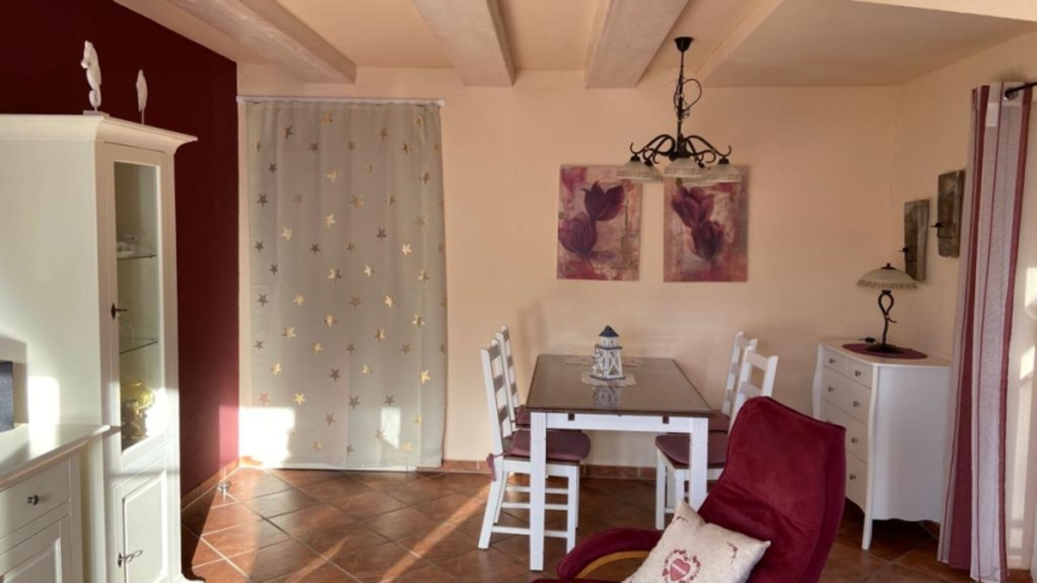 Der Raum kann mit Rollos und Verdunklungsvorhang an der Tür zur Küche, komplett abgedunkelt werden.