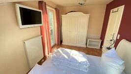 Das Schlafzimmer wurde mit Doppelbett, Kleiderschrank und einem weiteren Fernseher ausgestattet. Der Zugang zum Südbalkon ist von hier aus ebenso möglich wie der Blick in den Sternenhimmel durch das Dachfenster.