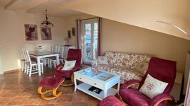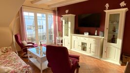 Das 70 m² große, durchgängig geflieste Zweiraum-Appartement (54 m² Wohnfläche) befindet sich im zweiten Obergeschoss unter kuscheligen Dachschrägen und ist sehr geschmackvoll und romantisch mit weißen Landhausmöbeln eingerichtet. .