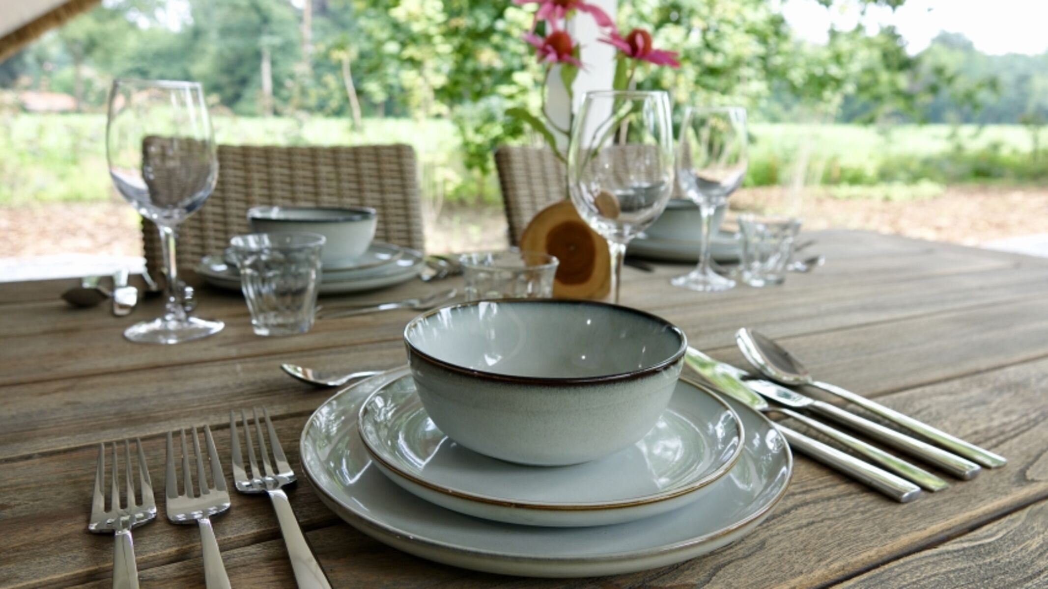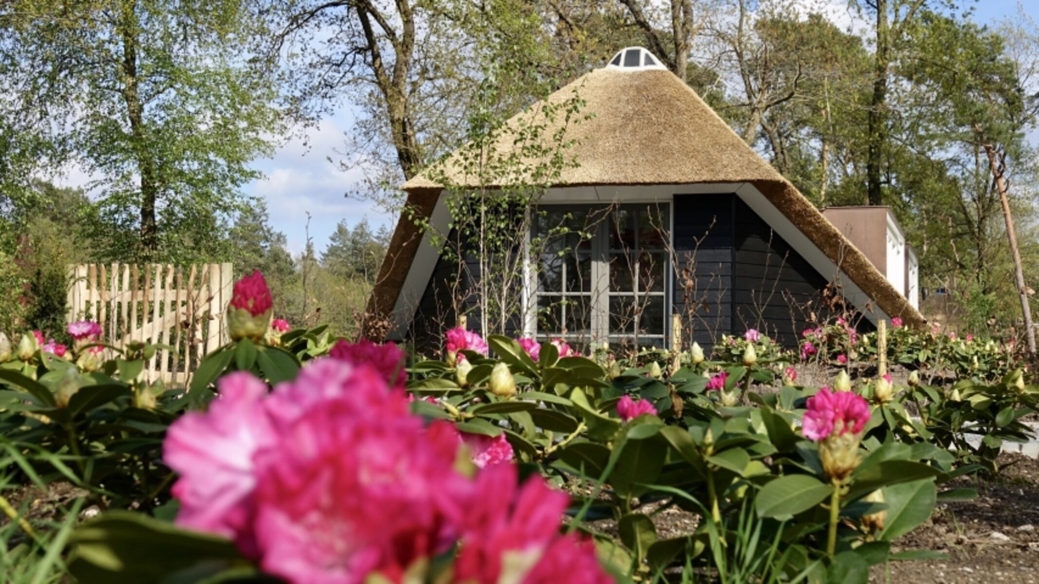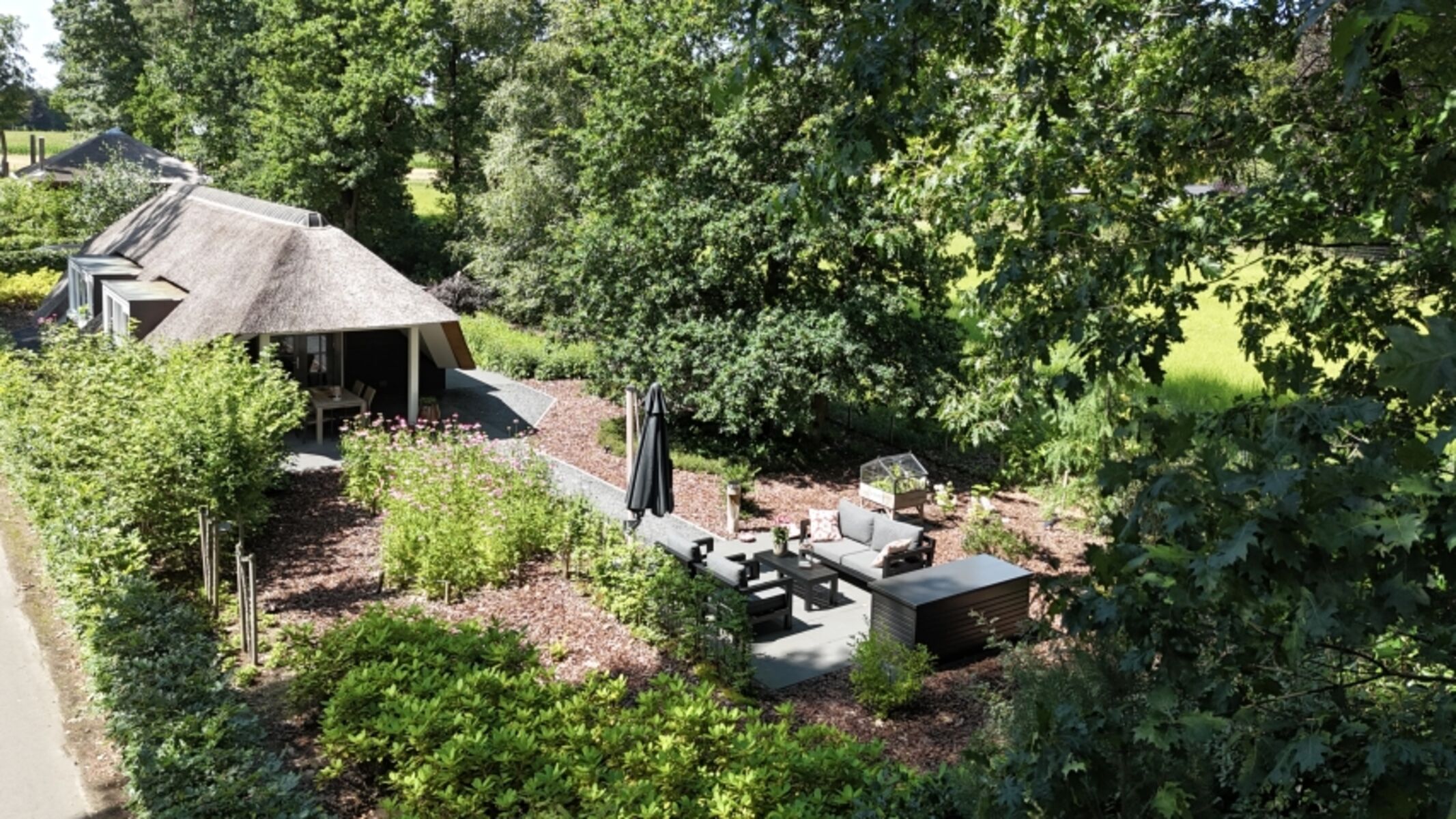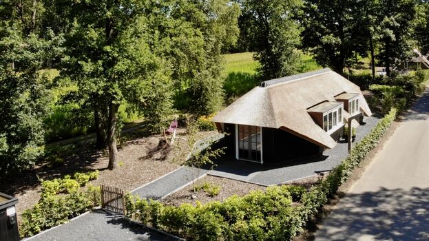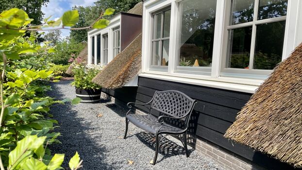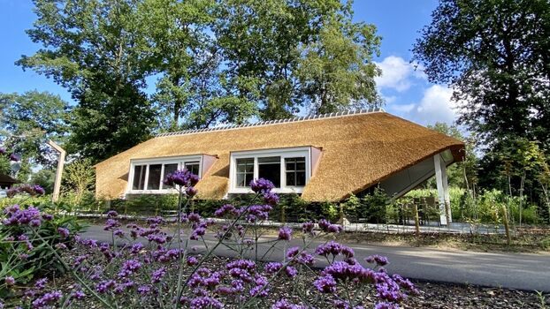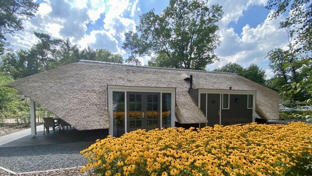 Der Name „Zonnehoed“ bezieht sich auf das schöne Reetdach, das sich über das gesamte Haus und die überdachte Terrasse erstreckt. Gleichzeitig ist es auch der Name der gelben (Rudbeckia) und violetten (Echinacea) Blumen, die im Garten blühen.