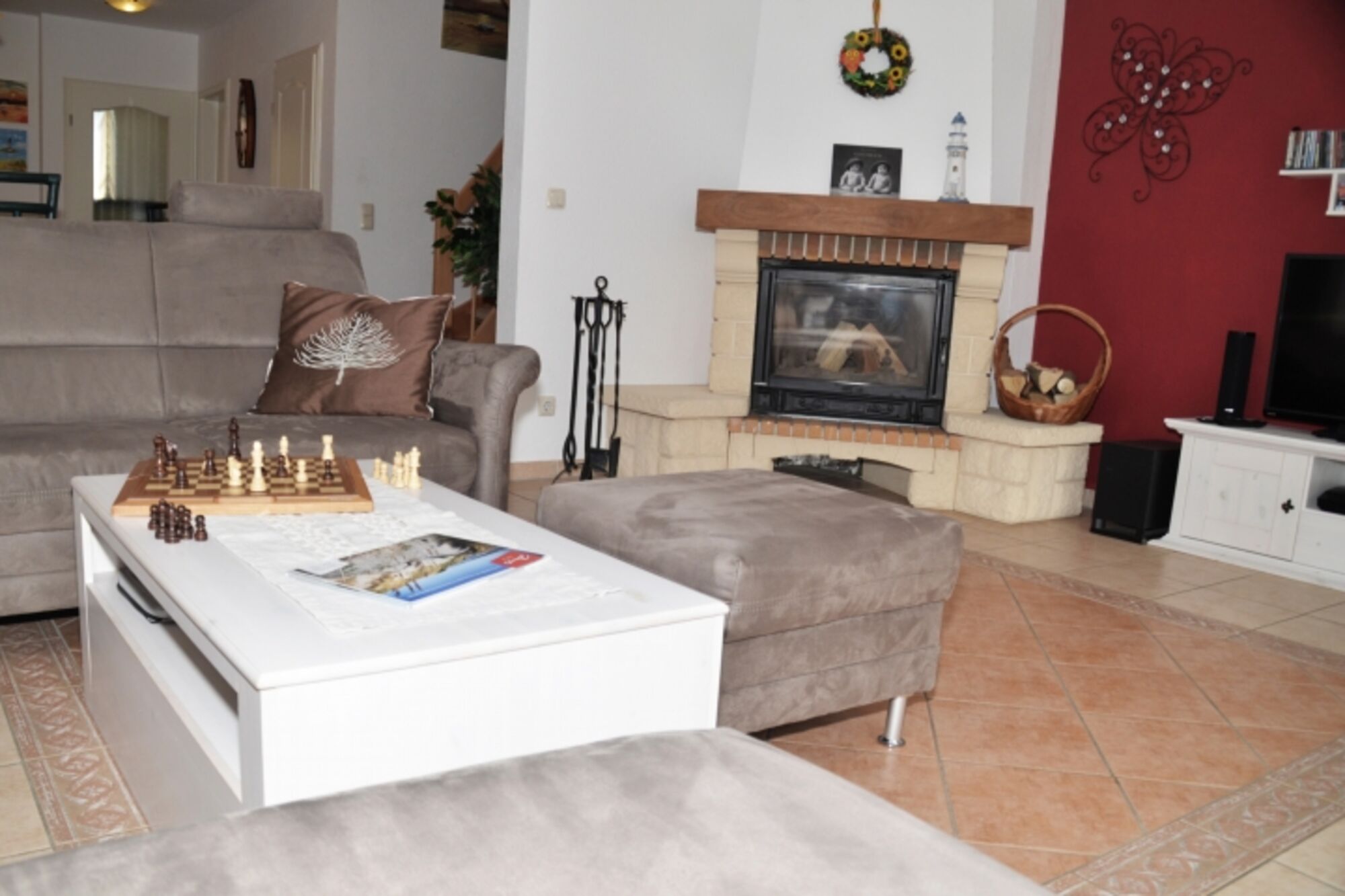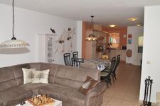 Komfortabler Wohn- Essbereich mit Eck-Sofa, HD-TV, Stereoanlage, DVD-Player, Wii, Natursteinkamin.
