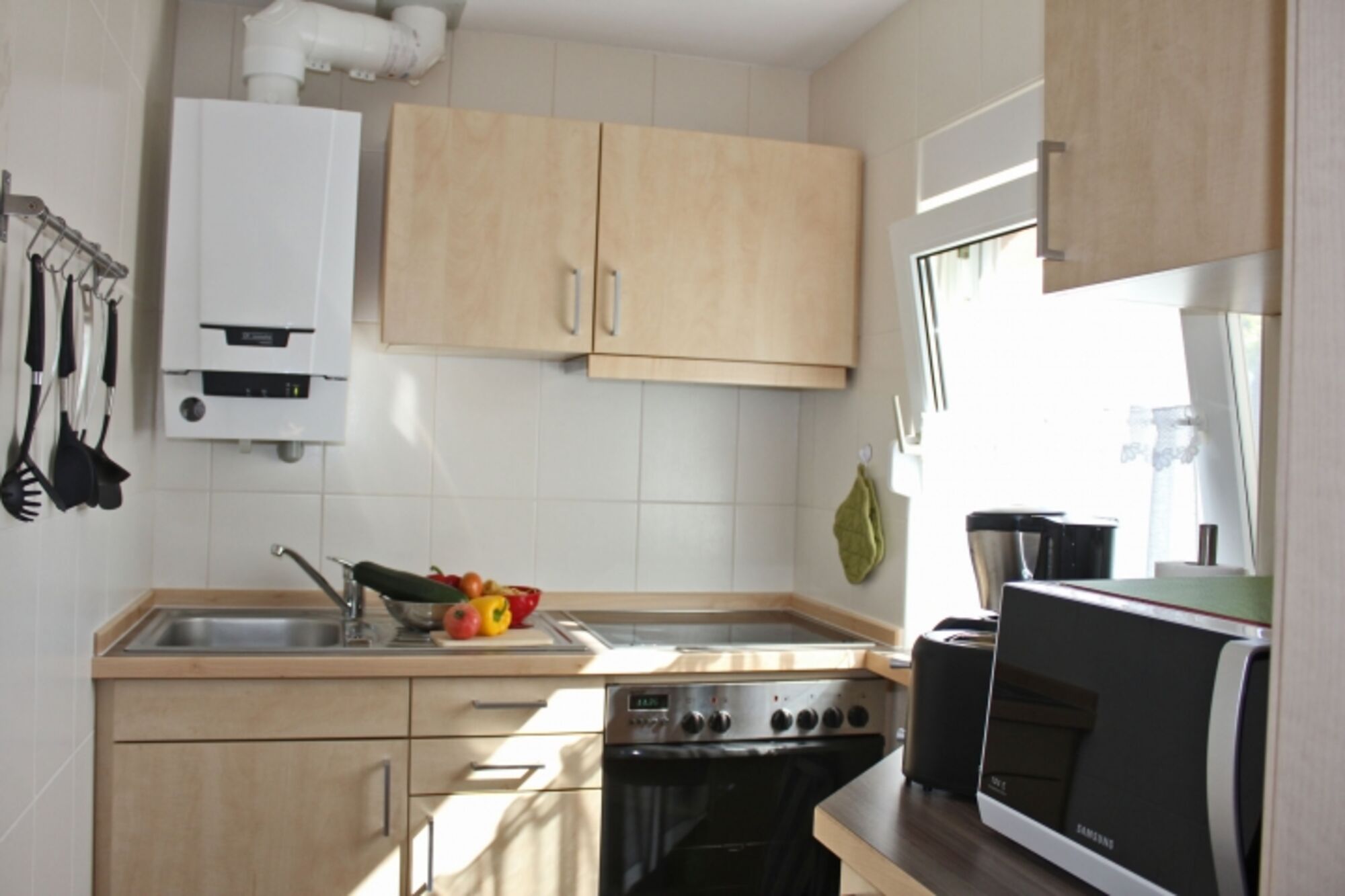 4-Platten Herd, Cerankochfeld, Dunstabzugshaube, Kühlschrank mit Gefrierfach, Korkenzieher / Flaschenöffner, Gewürze (Salz, Pfeffer, Zucker), Geschirrhandtücher, Mülltüten
