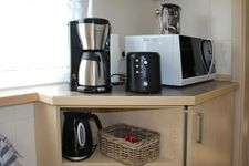Das komfortabel ausgestattete Ferienhaus verfügt über einen Wohn-/Essraum mit Sat-HD TV und CD-Radio, einen Schlafraum sowie ein Bad mit Dusche und WC und eine komplett zur Selbstverpflegung eingerichtete Küche (Kühlschrank mit Gefrierfach, Elektroherd mit Backofen, Geschirr, Kaffeemaschine, Mikrowelle, Toaster, Wasserkocher etc.).