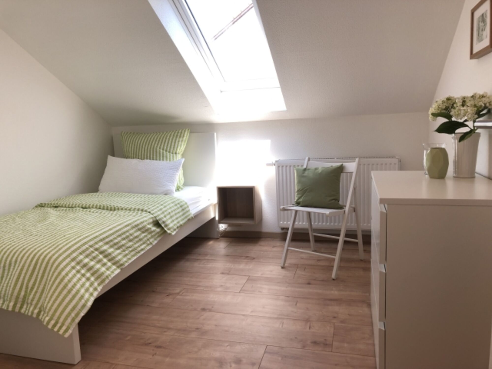 Ebenfalls im OG liegt dieses Schlafzimmer mit Einzelbett und Kommode.
