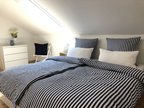 Dieses Schlafzimmer liegt im OG und bietet Ihnen ein Doppelbett (180 x 200) mit Taschenfederkernmatratzen, Kissen, Decken, Kleiderbügel, zwei Kommoden, Nachttische und Nachttischlampen. Selbstverständlich sind die Betten bereits fertig für Sie bezogen.