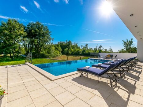 Die Villa ist ein ausgezeichneter Ausgangspunkt für einen aktiven Urlaub, da fast alle Strände in Istrien in nur 20 Minuten mit dem Auto erreichbar sind. Der Außenbereich umfasst einen großen Infinity-Pool mit modernen Liegestühlen, während die gepflegte Rasenfläche mit Lounge-Möbeln auf der Terrasse perfekte Entspannung bietet.