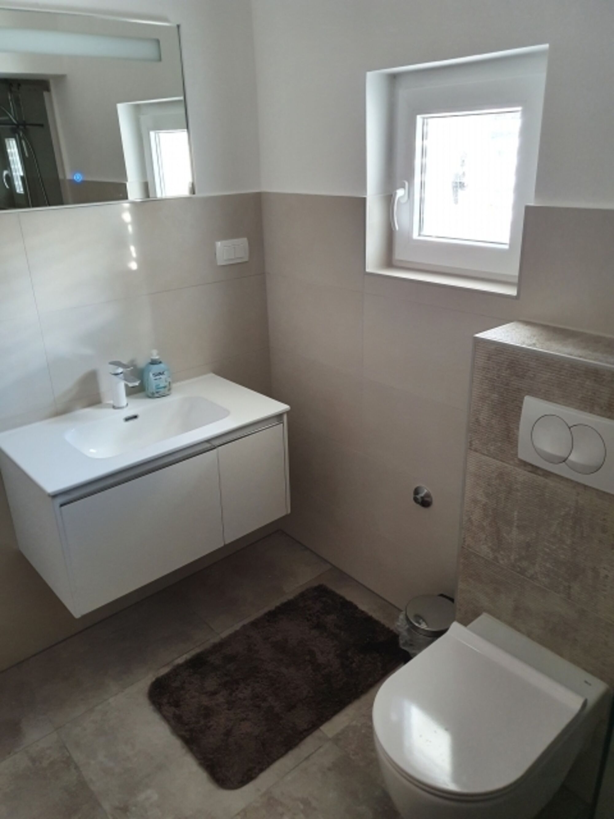 Waschbecken, Spiegel, Fenster im Bad, Fliegengitter