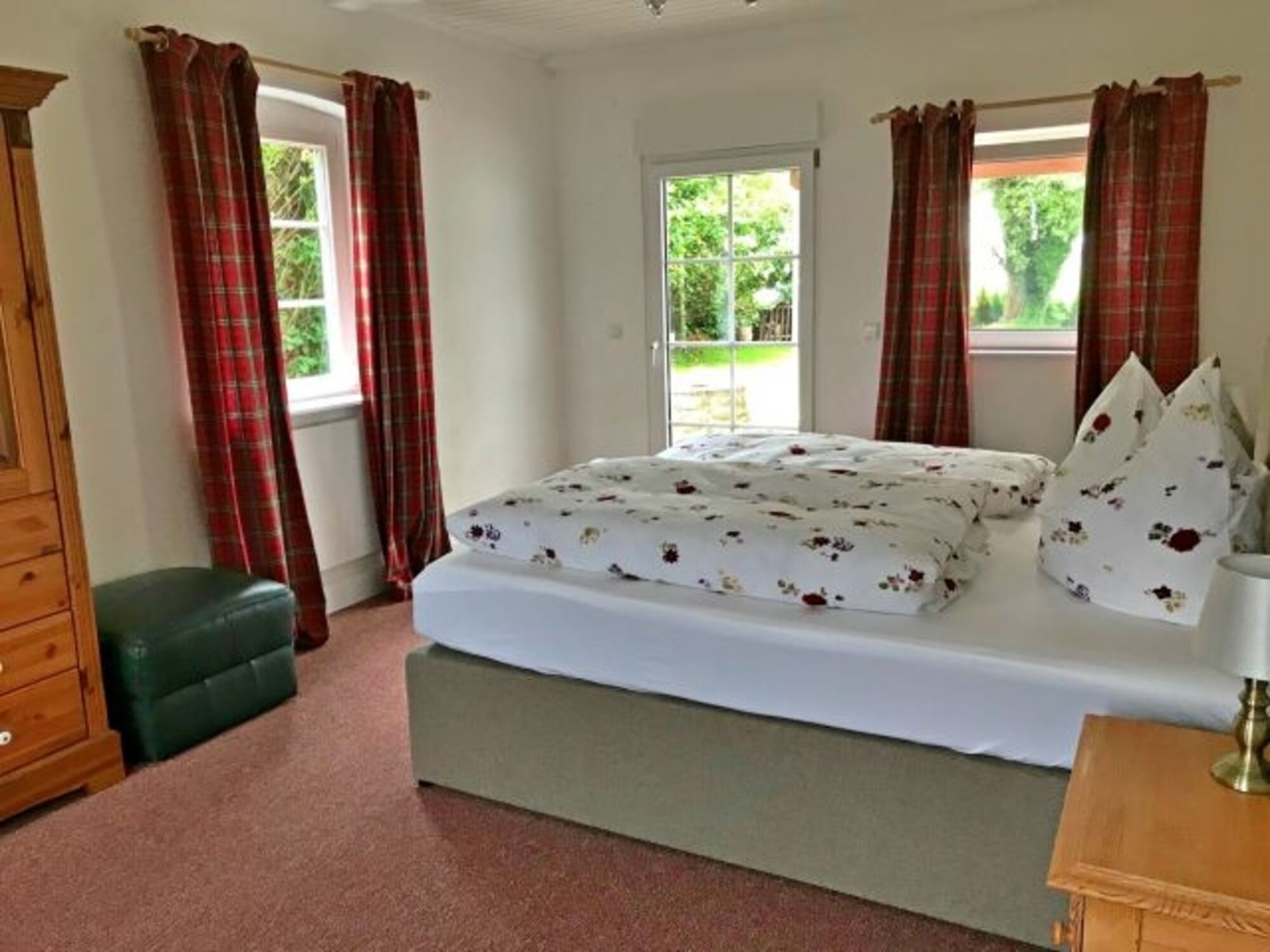 Dieses Schlafzimmer hat eine gemütliche Leseecke und einen Ausgang zur Terrasse bzw. in den Garten. Doppelbett 2,00 x 2,00m, Boxspringbett, Kommode, Wecker, Leselampe am Bett