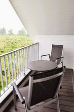 Die große, über Eck laufende Süd-Terrasse ist mit einem Tisch und sechs Sitzgelegenheiten mit Sonnenschirm sowie einem Strandkorb möbliert.
