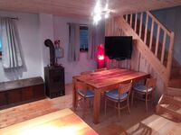 Unten ein Wohnzimmer mit Küche, Kamin, deutsches TV und Bad mit Dusche, oben zwei Schlafzimmer mit einem WC. Im Garten gibt es einen Teich, Schwimmteich, Sonnenliegen, Lagerfeuerstelle, Hängematten, Sauna, Whirlpool, Gartenmöbel und Grill.