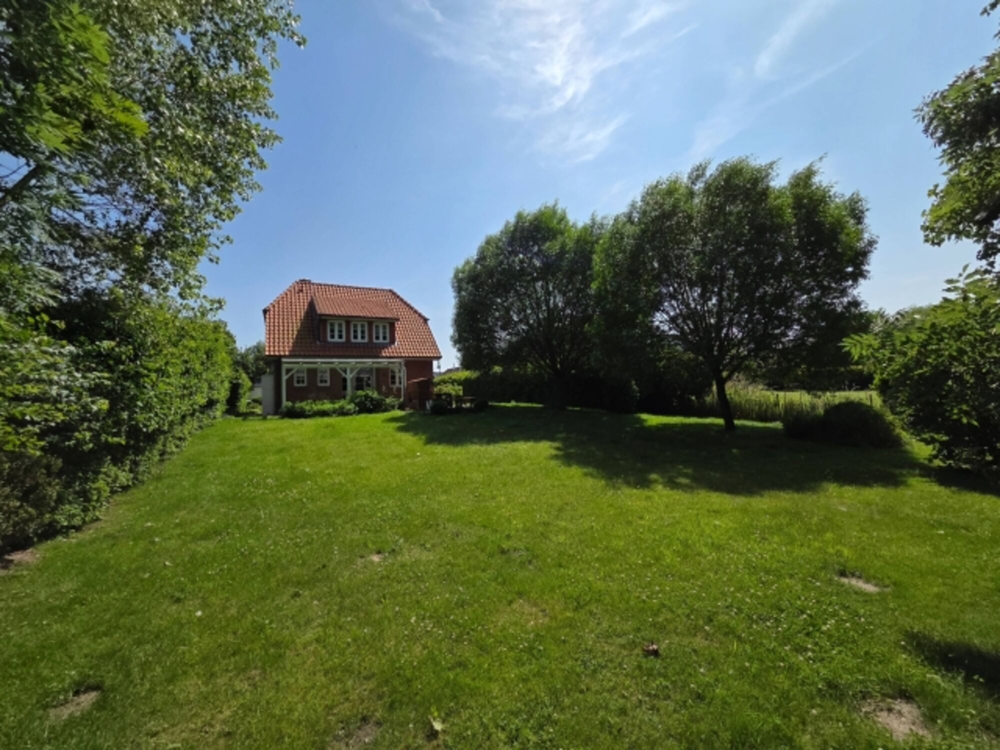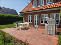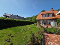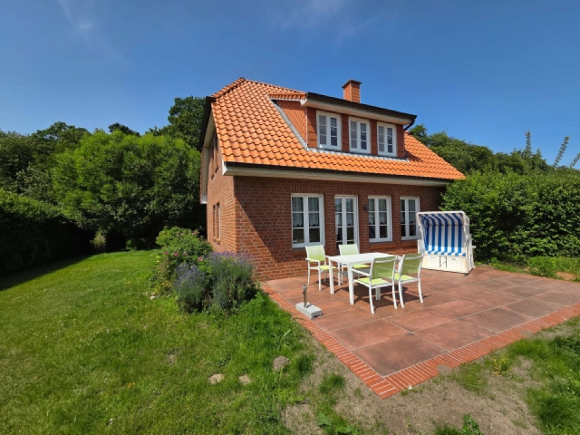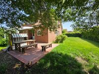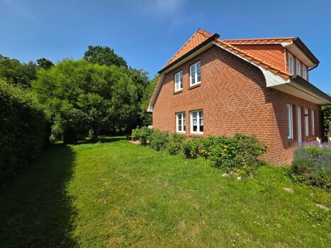 Der eingezäunte Garten verfügt über eine 1200 qm großzügige Liegewiese. Die Terrasse ist mit Strandkorb, Gartenmöbeln und Sonnenliegen ausgestattet.