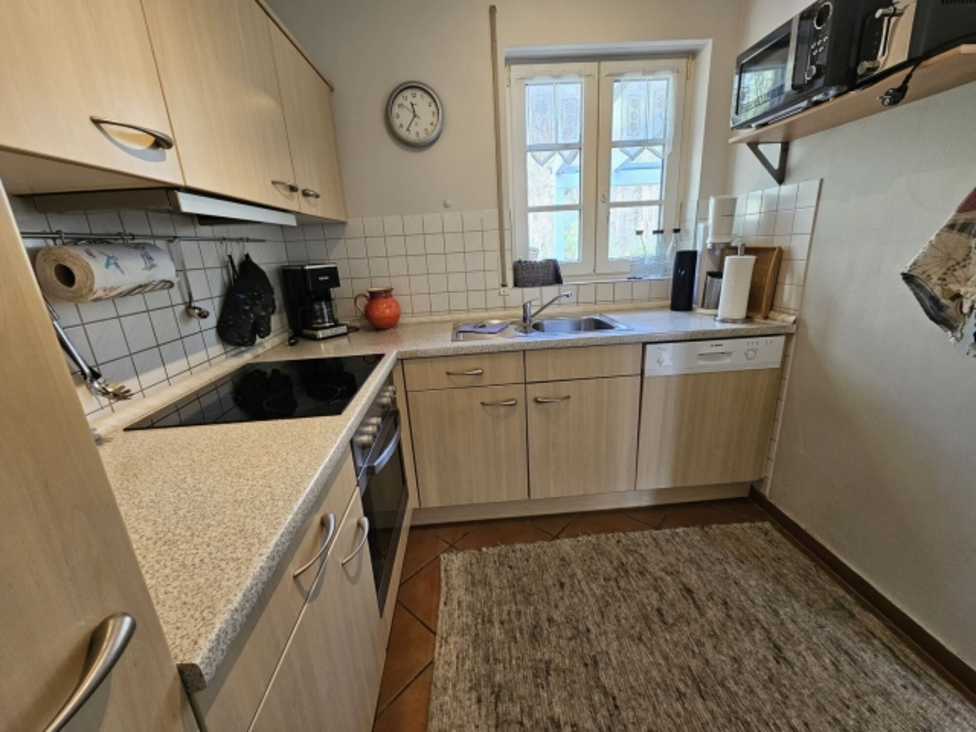 Die Geschlossene Küche ist umfangreich ausgestattet und verfügt über Ceran-Herd, Backofen , Mikrowelle, Spülmaschine sowie Kaffeemaschine, Wasserkocher, Toaster usw.
