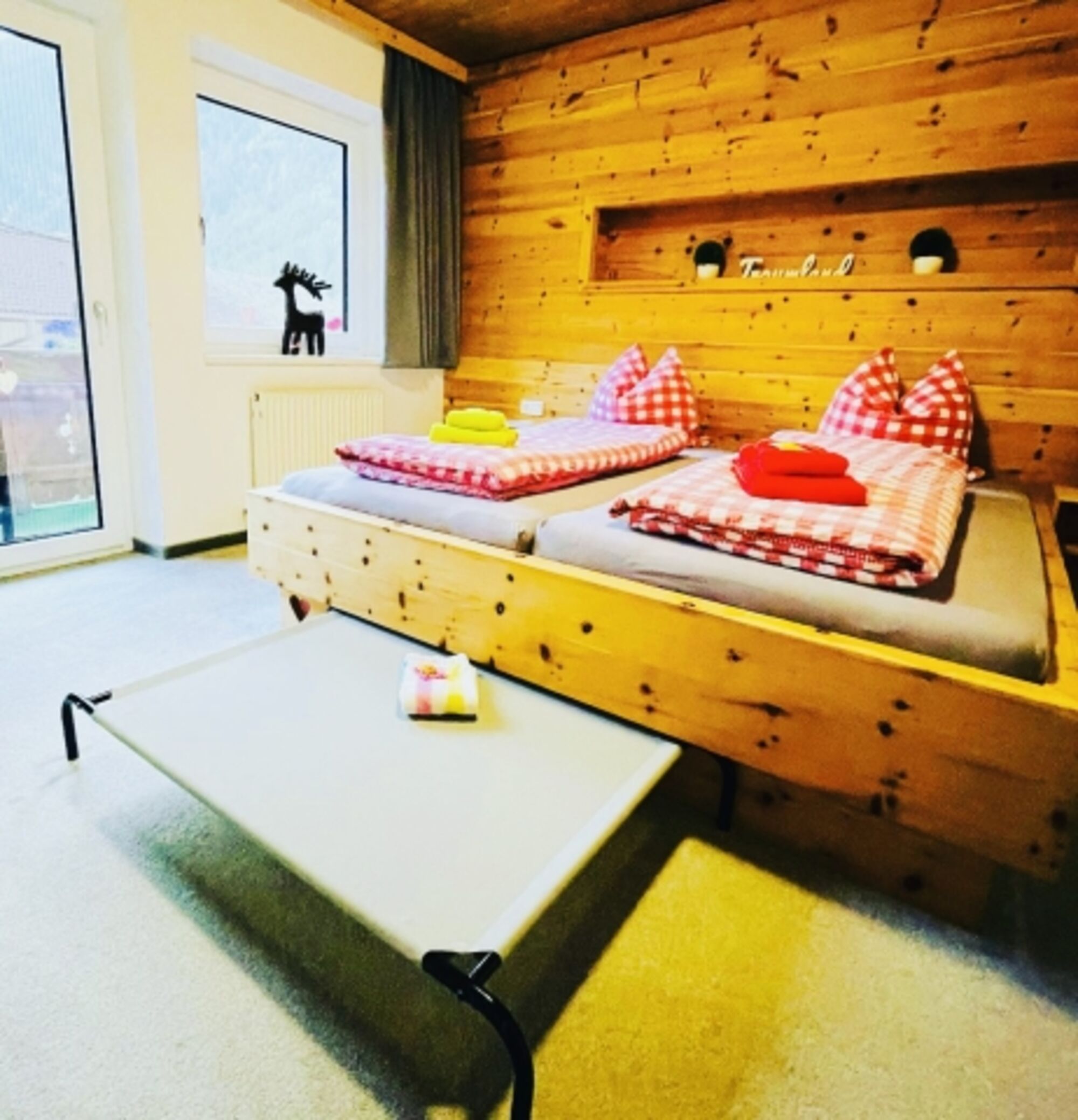 In diesem Zimmer haben 4 Personen Platz: Ein gemütliches Doppelbett und ein Schlafsofa für 2 Personen. Doppelbett 1,80 x 2,00m, Kommode, Leselampe am Bett