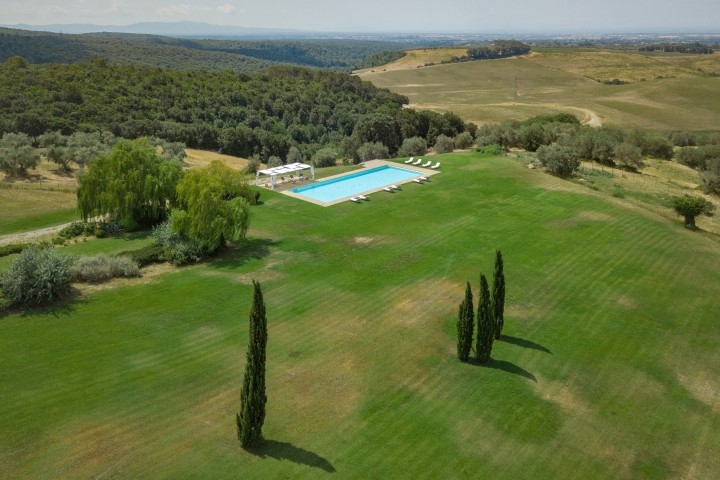 Villa und Landhaus La Marrana,ein bezauberndes Landhaus, das man über eine gut erhaltene nicht asphaltierte Strasse die 4,5km lang ist erreicht, ist ein einzigartiger Ort im Herzen eines der exklusivsten Weingüter der Toskana. Das Anwesen von 1500ha Land gehört einer Adelsfamilie. Es bietet einen atemberaubenden Blick auf das Tyrrhenische Meer. In der Ferne können Sie die Inseln vor der etruskischen Küste sehen. Ebenso gibt es ein Pferdegestüt von 250ha und eine Limousine-Zucht. Ausserdem wird hier der weltberühmte Wein von Terriccio angebaut.