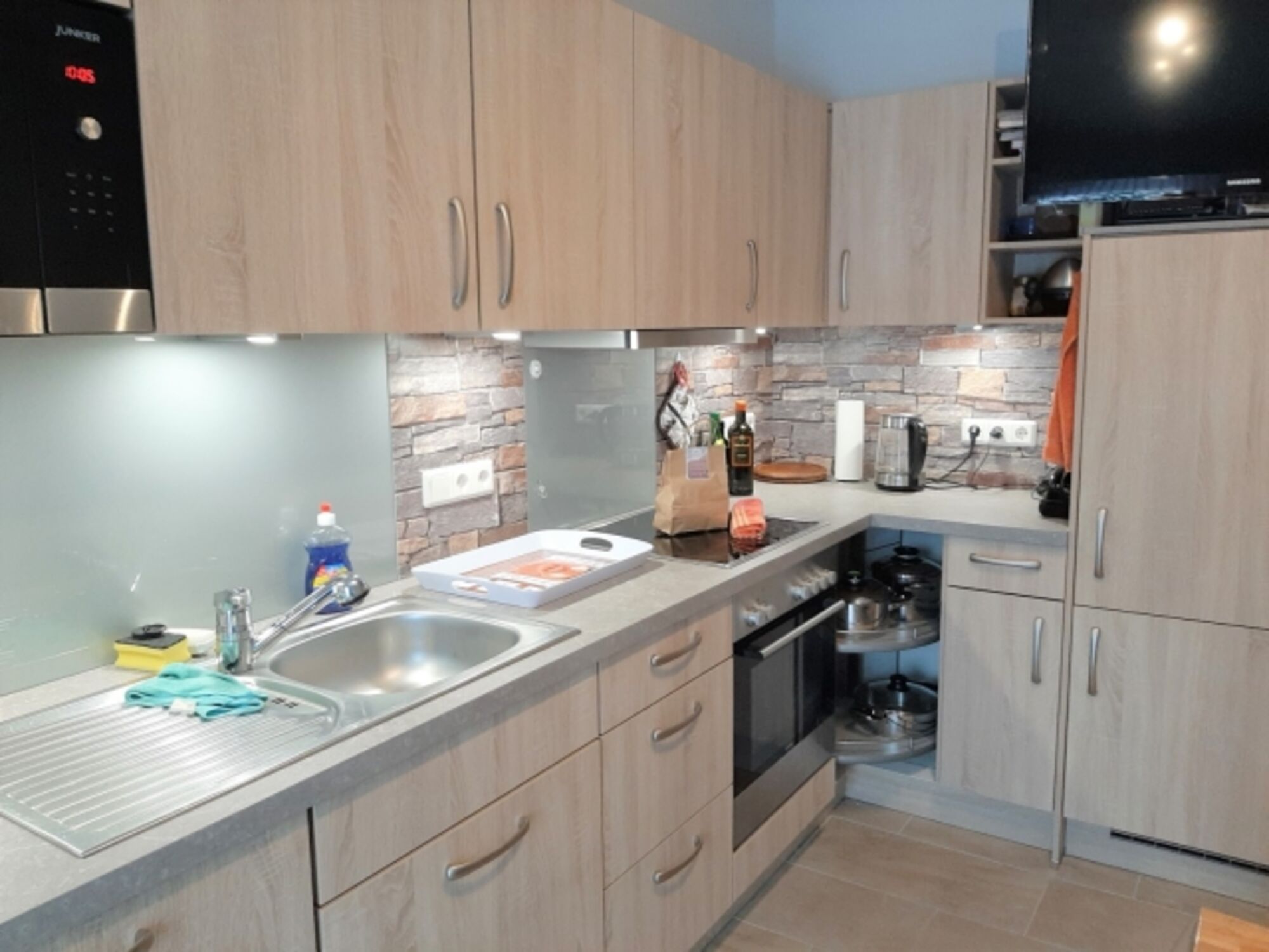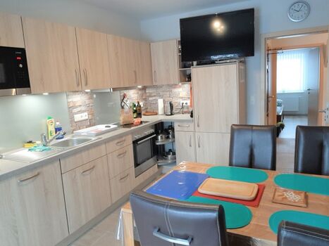 Cerankochfeld, Dunstabzugshaube, Gefrierschrank, Eierkocher, Essplatz in der Küche, TV in der Küche