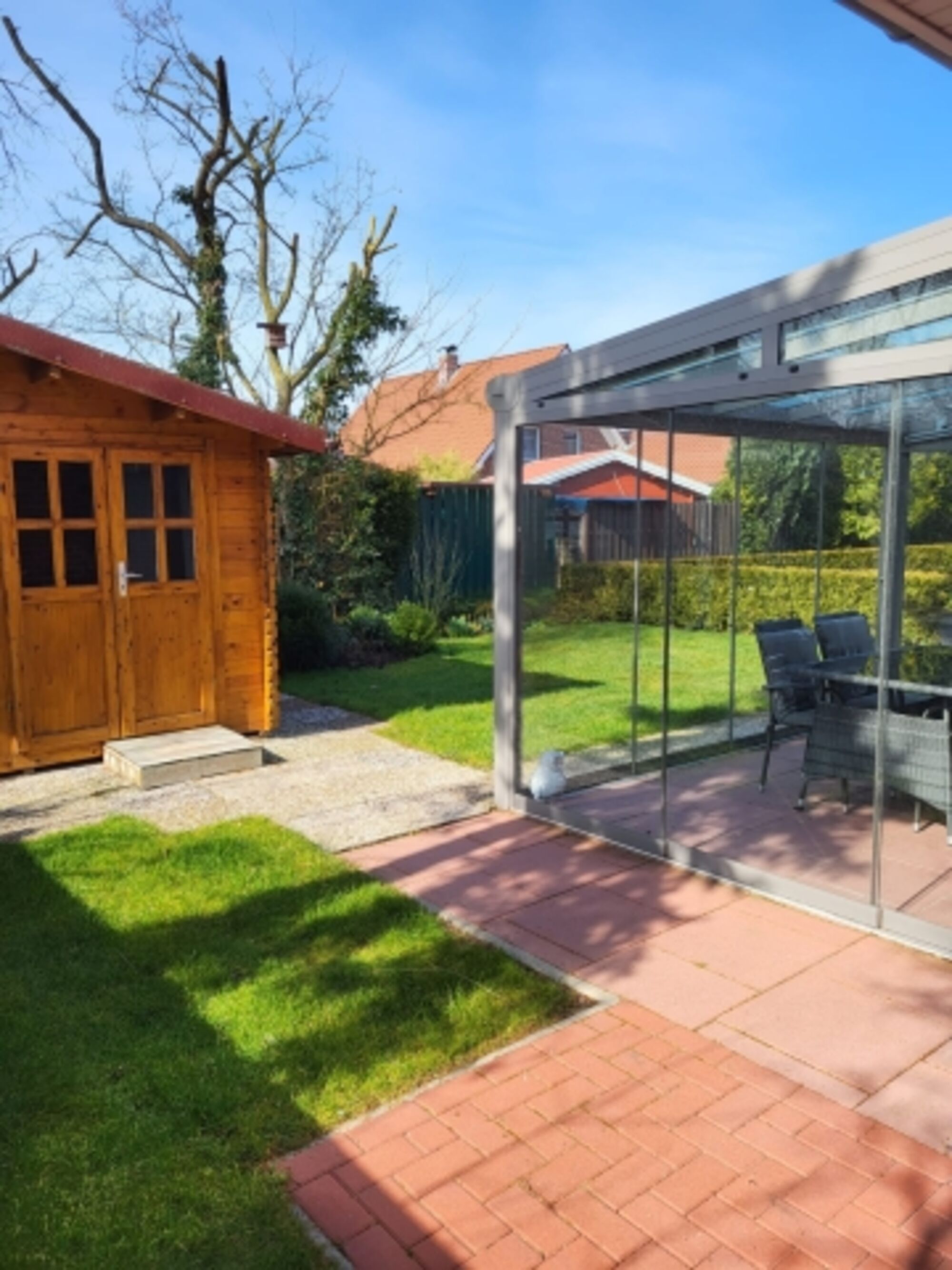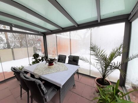 Der moderne Sommergarten, deren Scheiben sich alle öffnen lassen, ermöglicht es an lauen Abenden bei einem kühlen Glas Wein oder beim gemeinsamen Grillen zu verweilen.