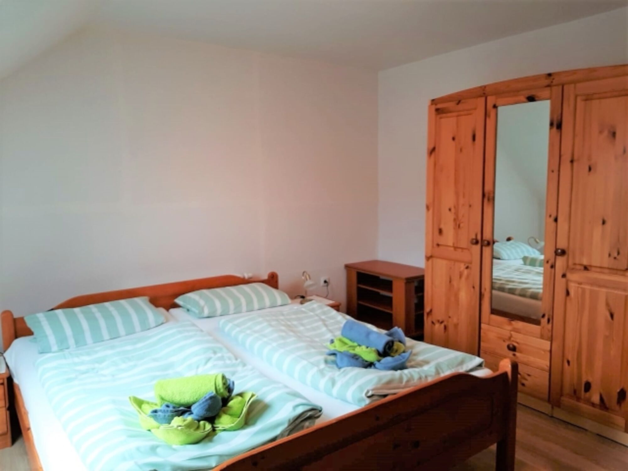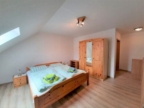 Die Wohnung verfügt über 3 Schlafzimmer – 2 im Erdgeschoss (eins mit einem Doppelbett (180×200) sowie eina mit einem Einzelbett (90×200)) . Ein weiteres Schlafzimmer steht im Obergeschoss im einem Doppelbett (180x200) zur Verfügung.