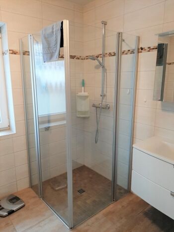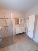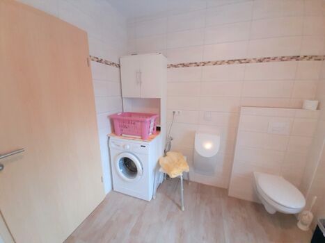 In dem modernen Bad mit einer ebenerdigen Dusche können Sie den Tag perfekt starten. Hier steht Ihnen auch eine Waschmaschine zur Verfügung.