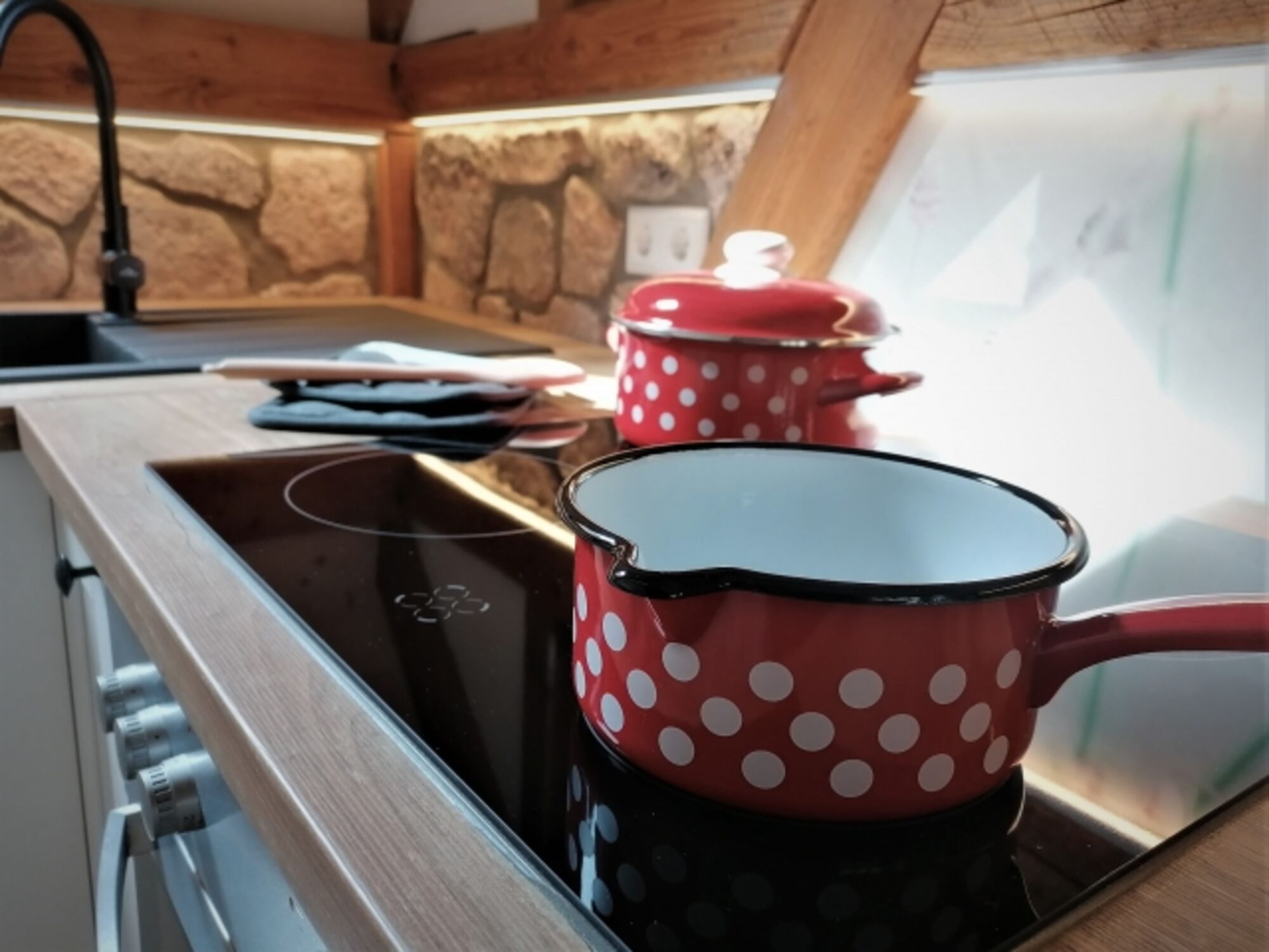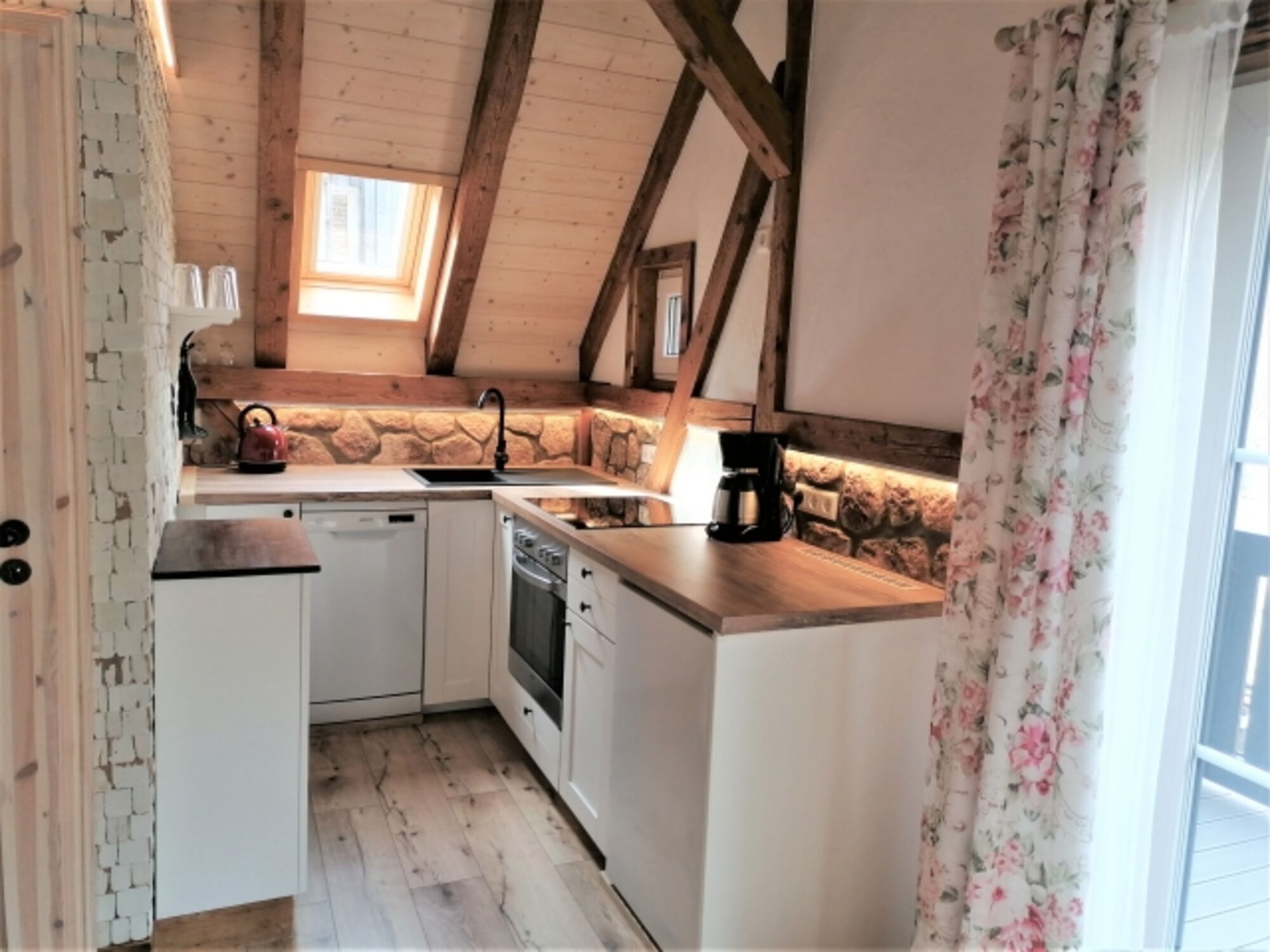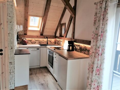 Offene Küche mit Kochfeld, Backofen, Geschirrspüler. Kaffeemaschine (Filter), Wasserkocher.