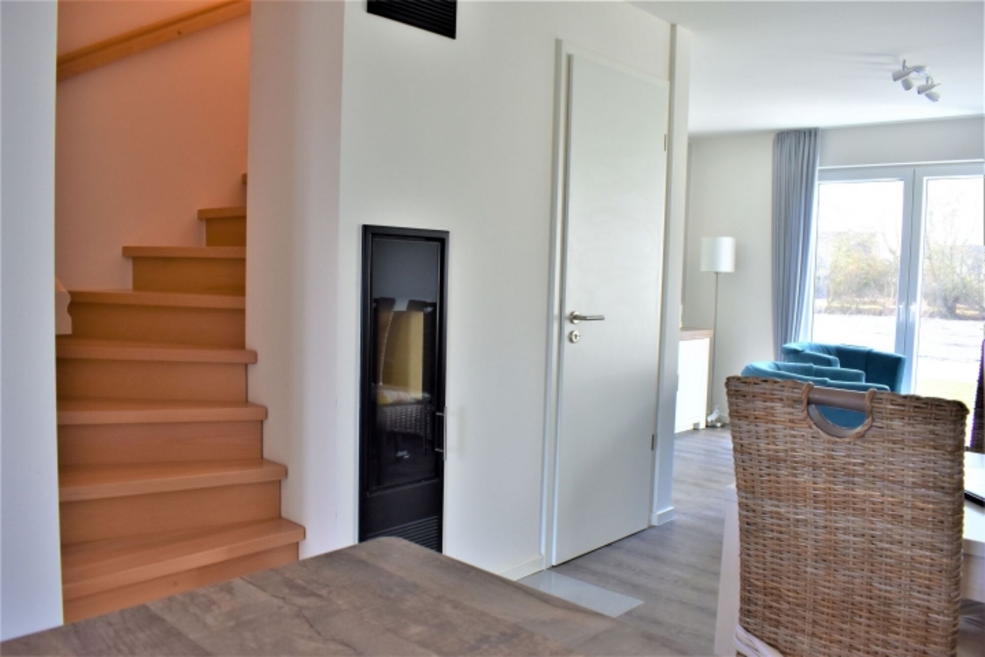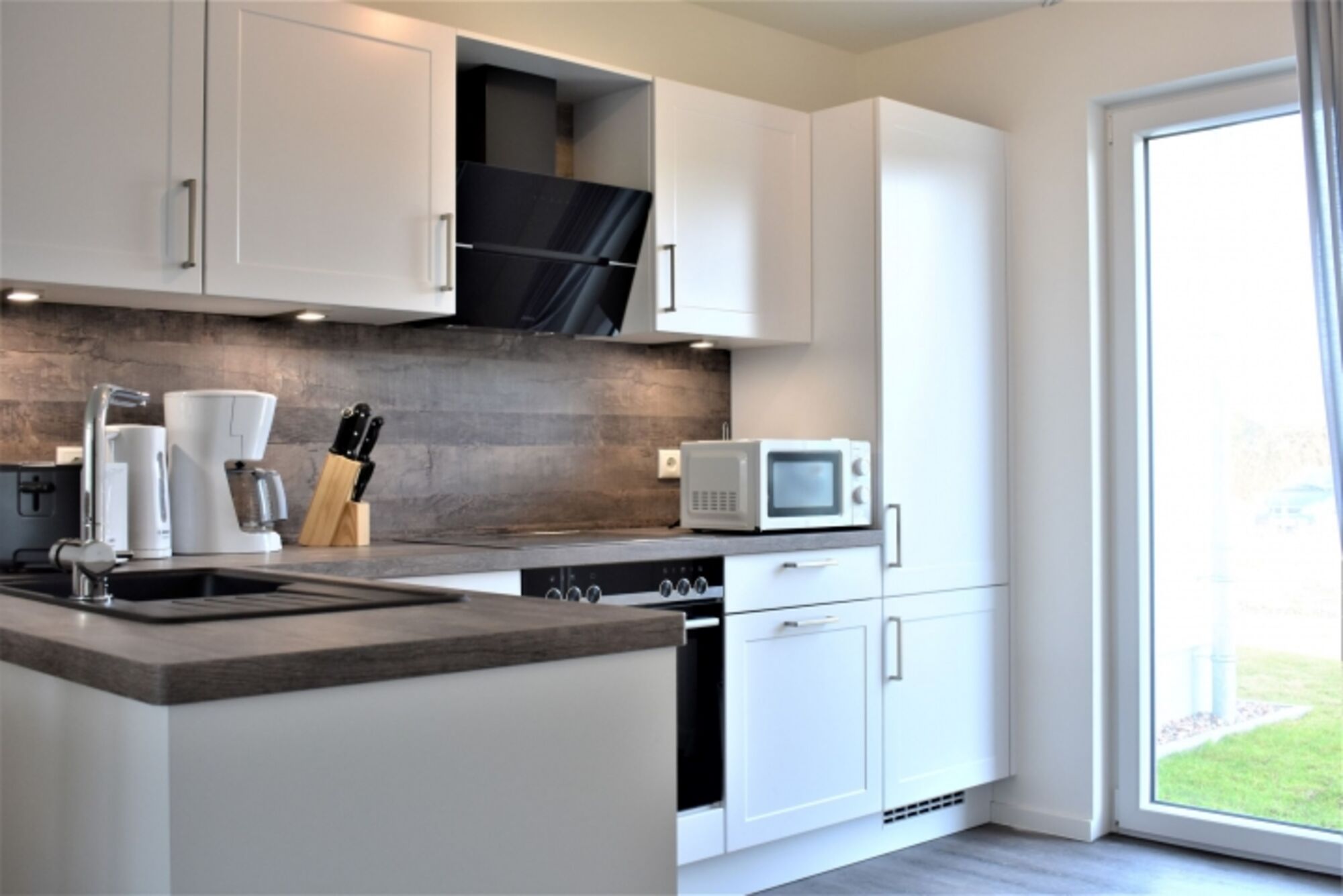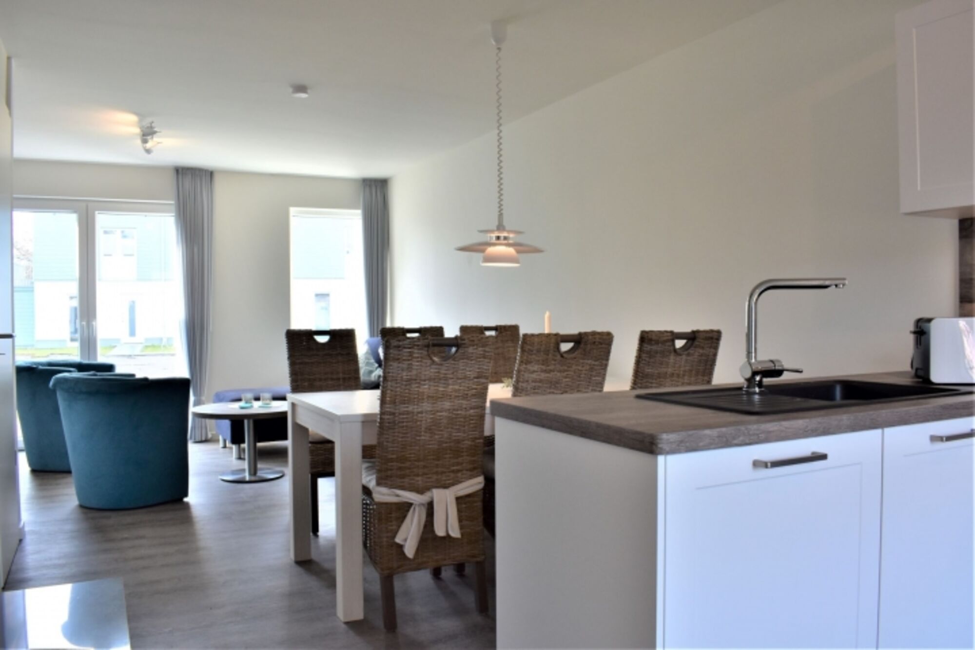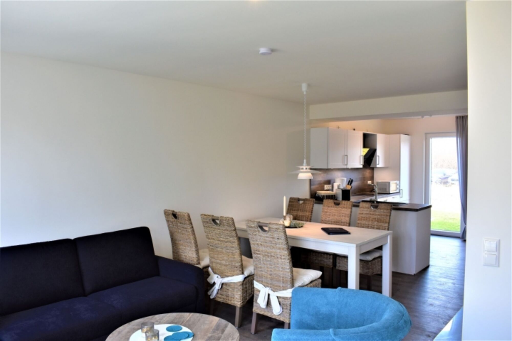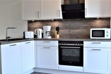 Über einen kleinen Windfang erreichen Sie den hellen und freundlichen Wohnbereich, die Küche ist offengehalten und mit einer hochwertigen Einbauküche inklusive Mikrowelle ausgestattet.