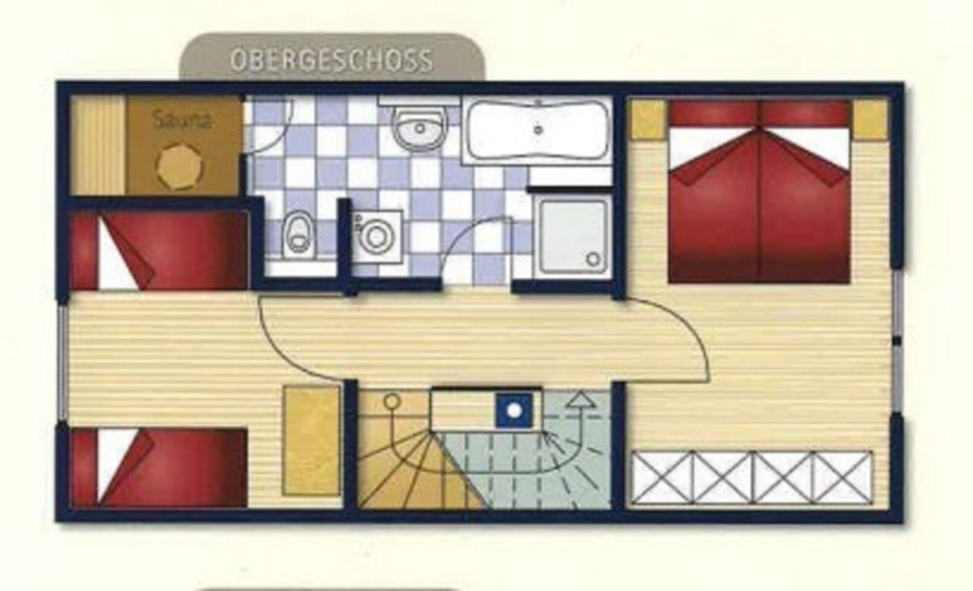 Die erste Etage bietet Ihnen, neben zwei Schlafräumen, das große Bad mit Dusche, Badewanne und Sauna.