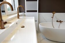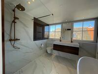 Doppelwaschbecken, Regendusche, Spiegel, Fenster im Bad