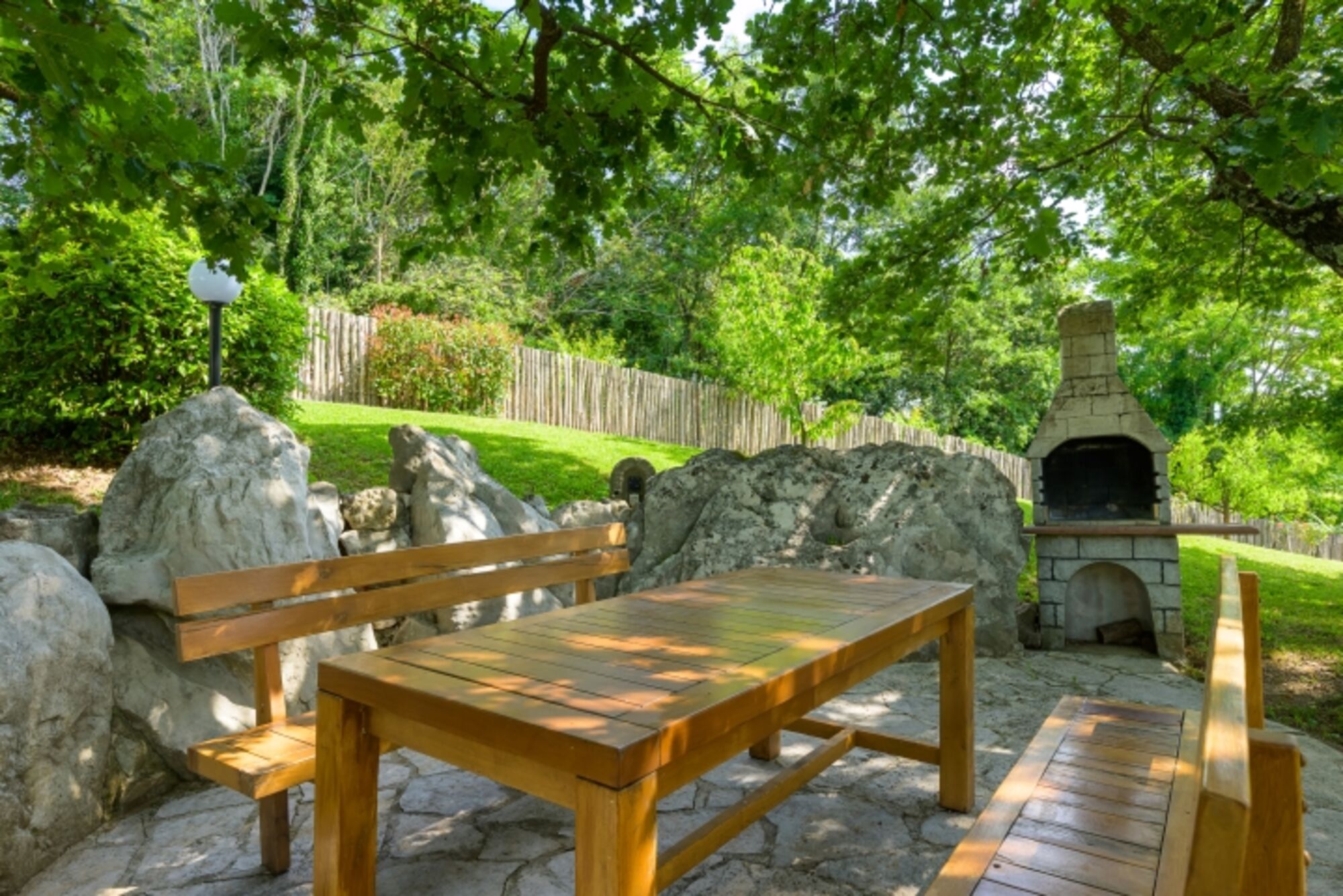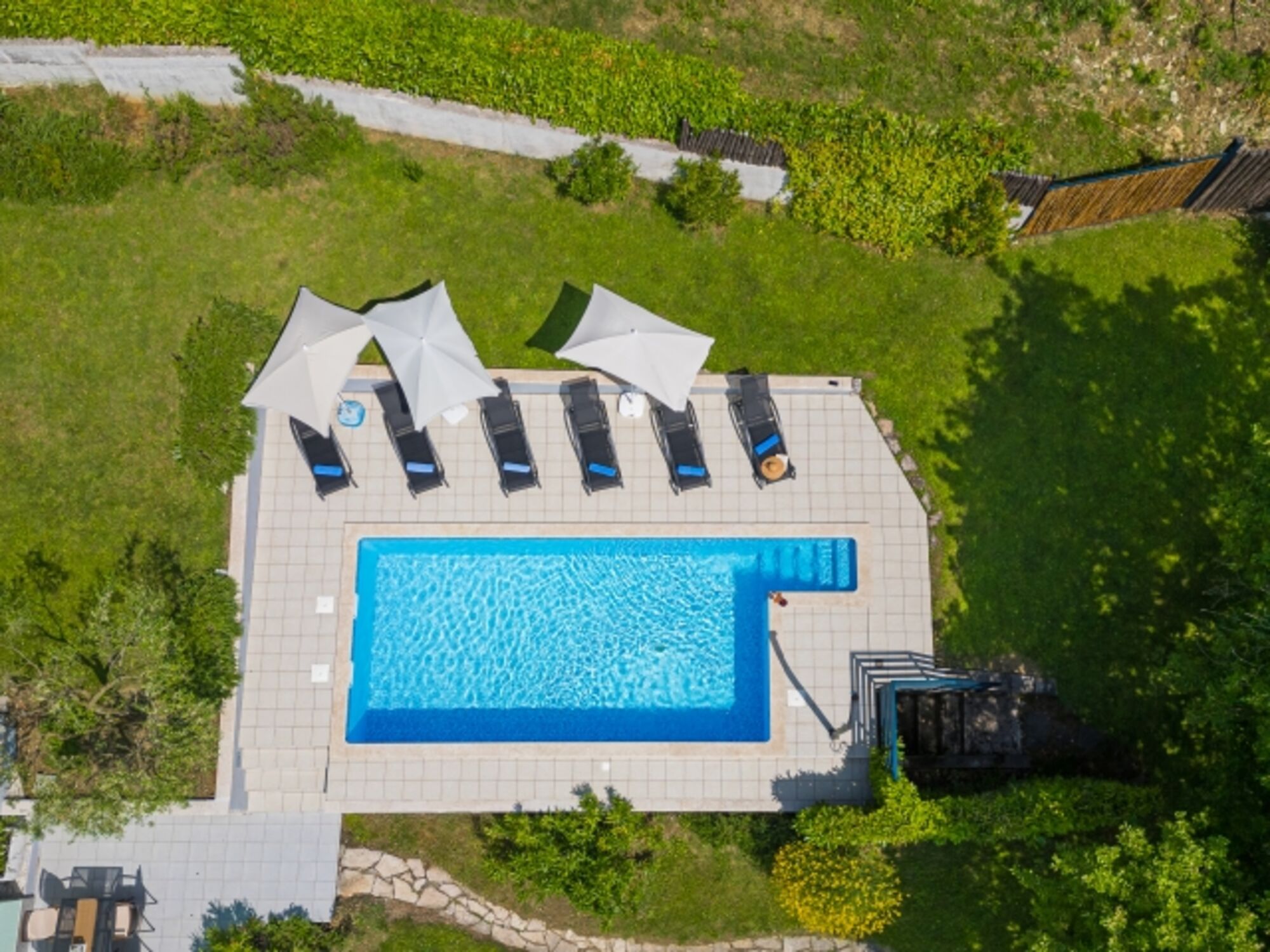 Für einen Hauch frischer Luft im Garten gibt es einen großen Außenpool von 26 m² mit den dazugehörigen Geräten zum Essen und Sonnenbaden. Neben dem spektakulären Blick auf die Terrasse des Wohnzimmers bietet Stella Brigita ein umfassendes Naturerlebnis mit einem Grill unter einer jahrhundertealten Eiche. Der tiefe Schatten und der Duft von Lavendel sind ein sicheres Rezept für völlige Entspannung.