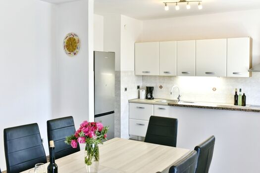 4-Platten Herd, Cerankochfeld, Kühlschrank mit Gefrierfach, Korkenzieher / Flaschenöffner, Geschirrhandtücher