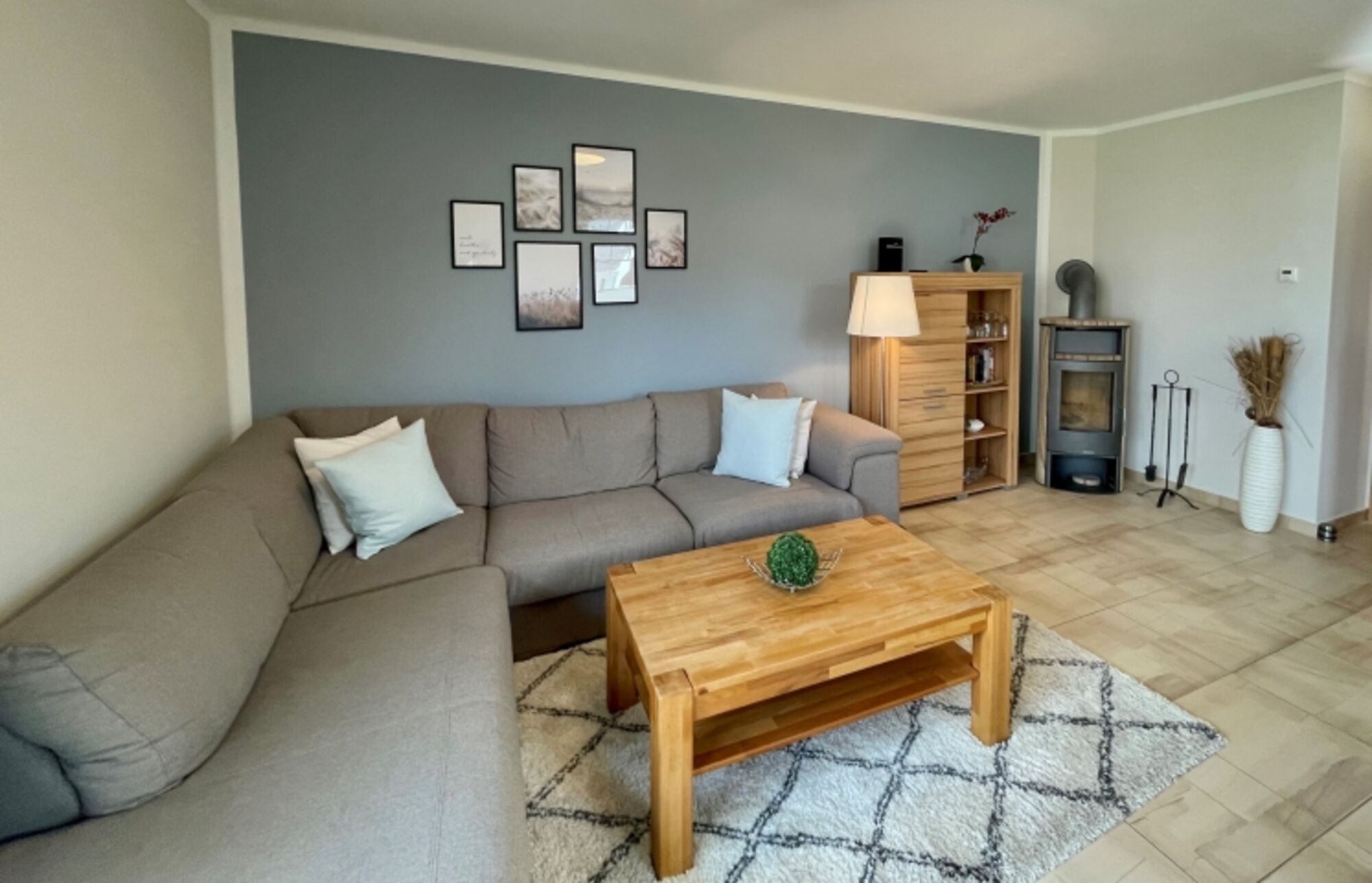 Das gemütlich eingerichtete Wohnzimmer mit Kaminofen lädt auch im Winter zum Erholen ein.