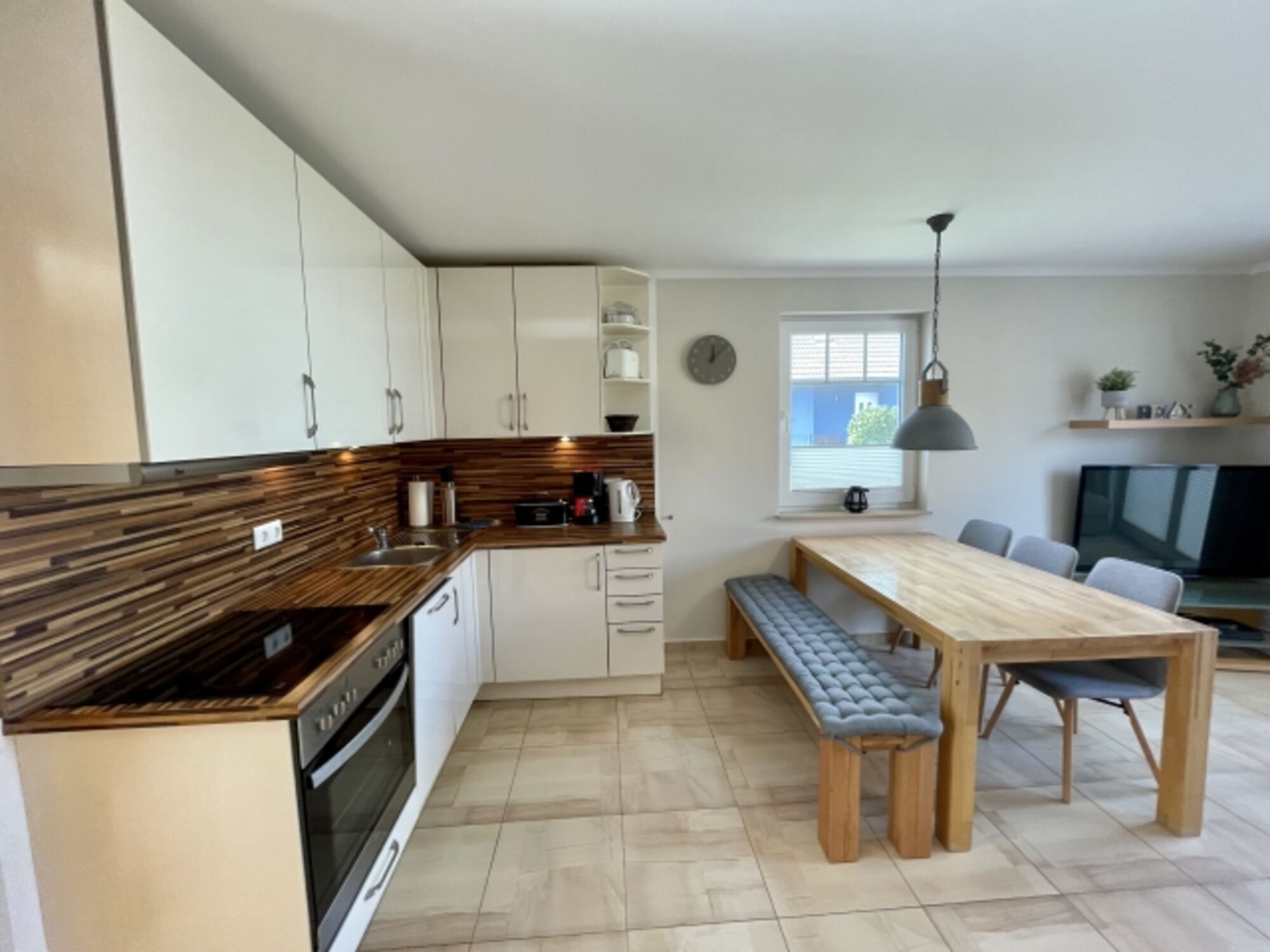 4-Platten Herd, Cerankochfeld, Dunstabzugshaube, Kühlschrank mit Gefrierfach, Gefrierschrank, Eierkocher, Mixer, Korkenzieher / Flaschenöffner, Essplatz in der Küche