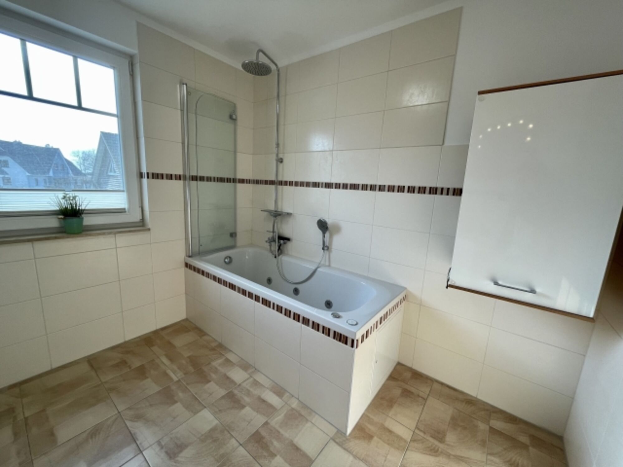 Badewanne mit Whirlpool, Waschbecken, Spiegel, Fenster im Bad