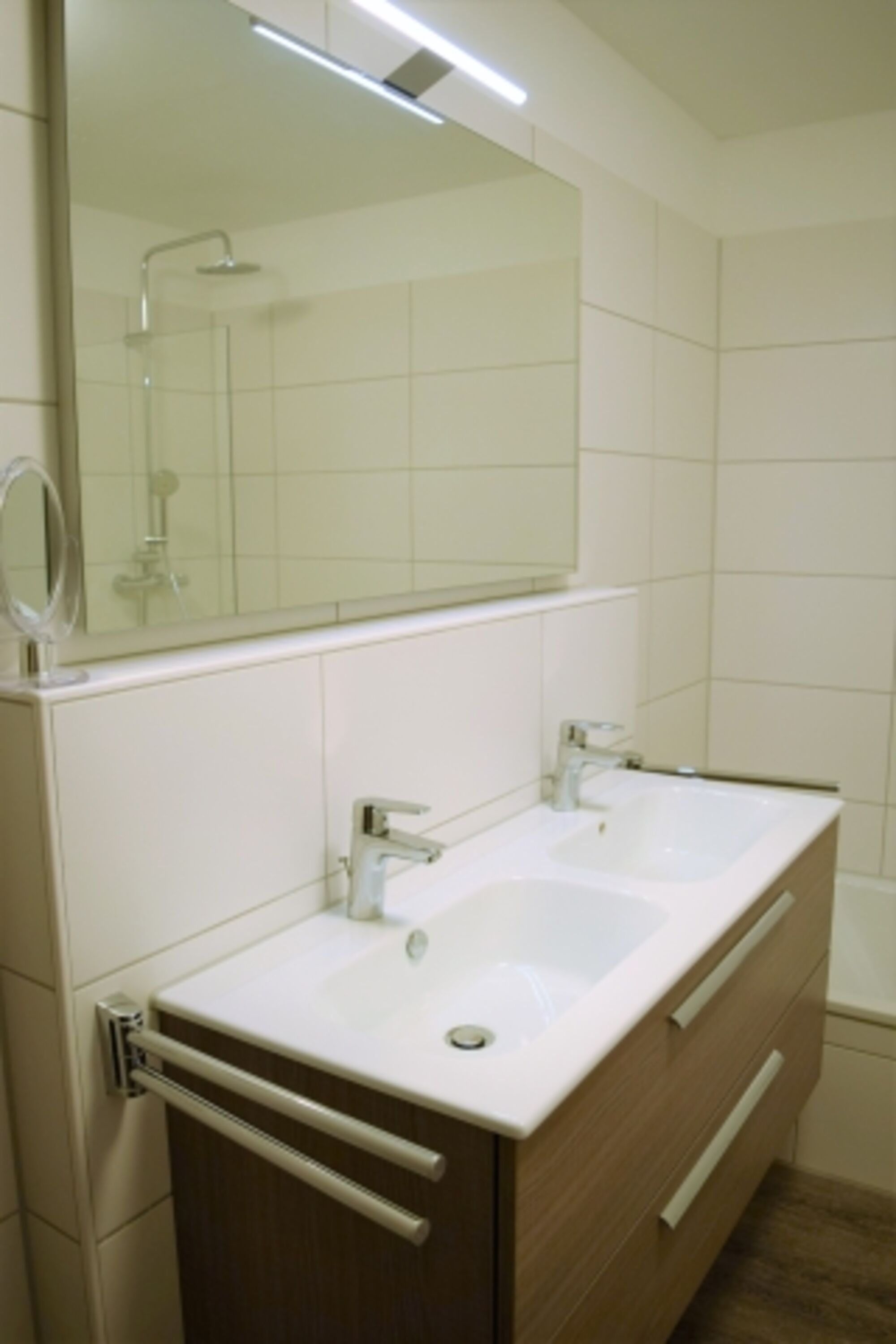 Die erste Etage bietet Ihnen, neben zwei Schlafräumen, das große Bad mit Doppelwaschtisch, zwei Duschen, einer Badewanne und hauseigener Sauna.