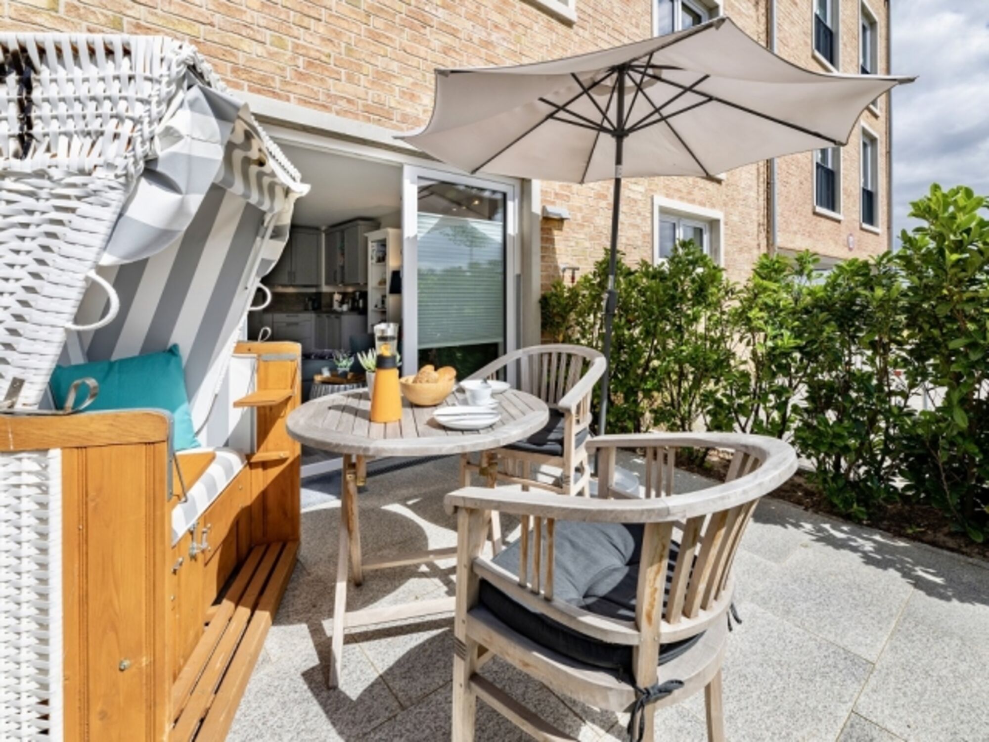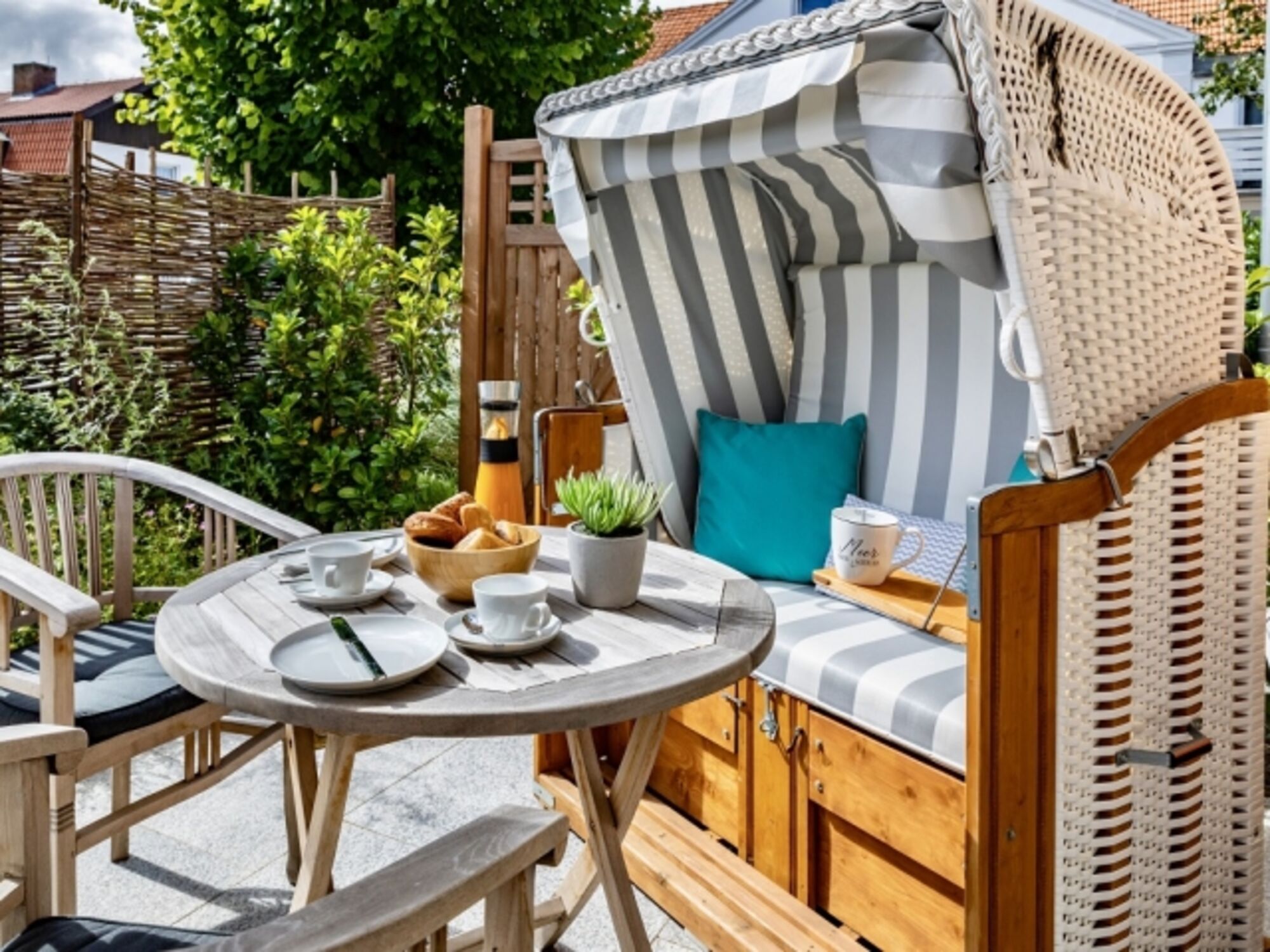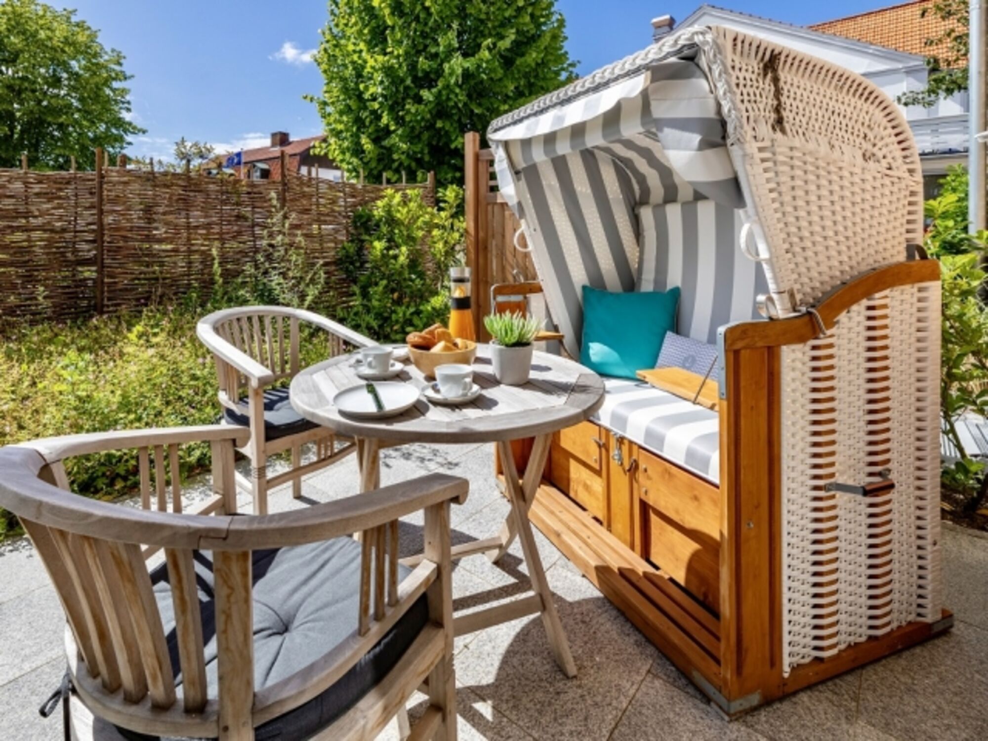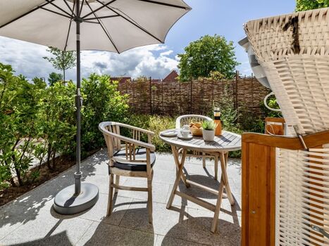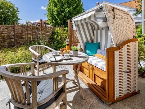 • Süd-West-Terrasse mit Strandkorb, Gartenmöbeln & Sonnenschirm