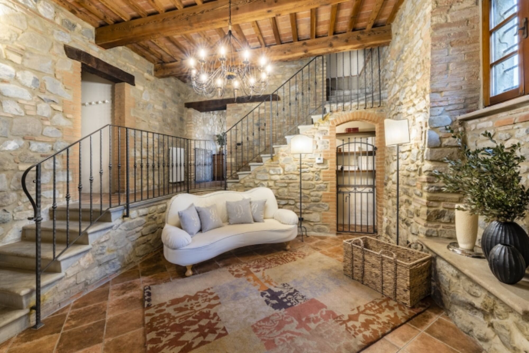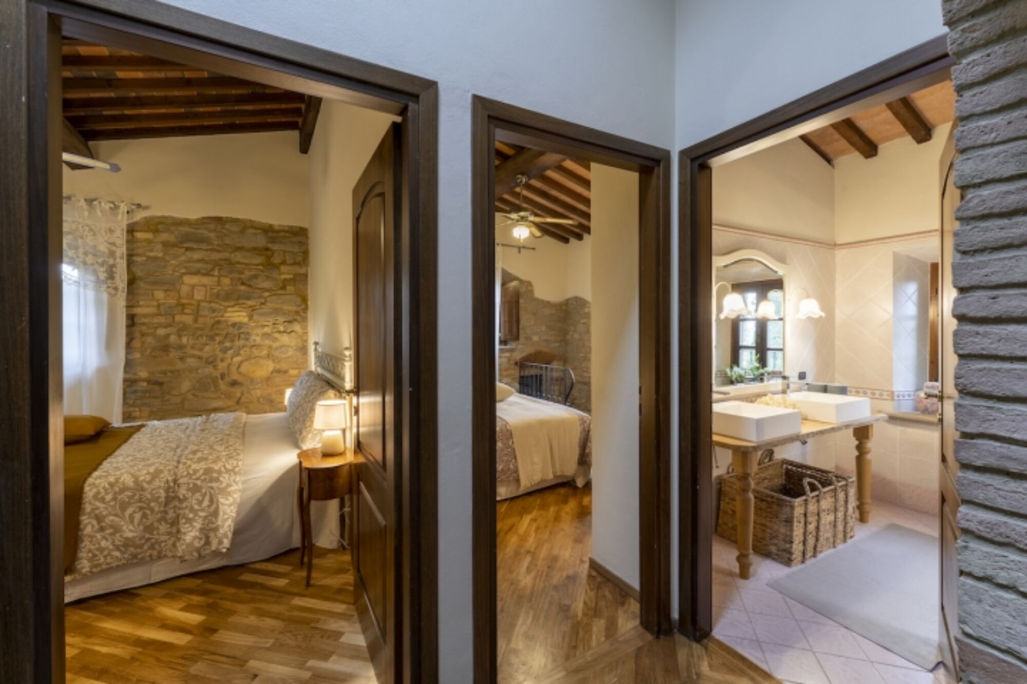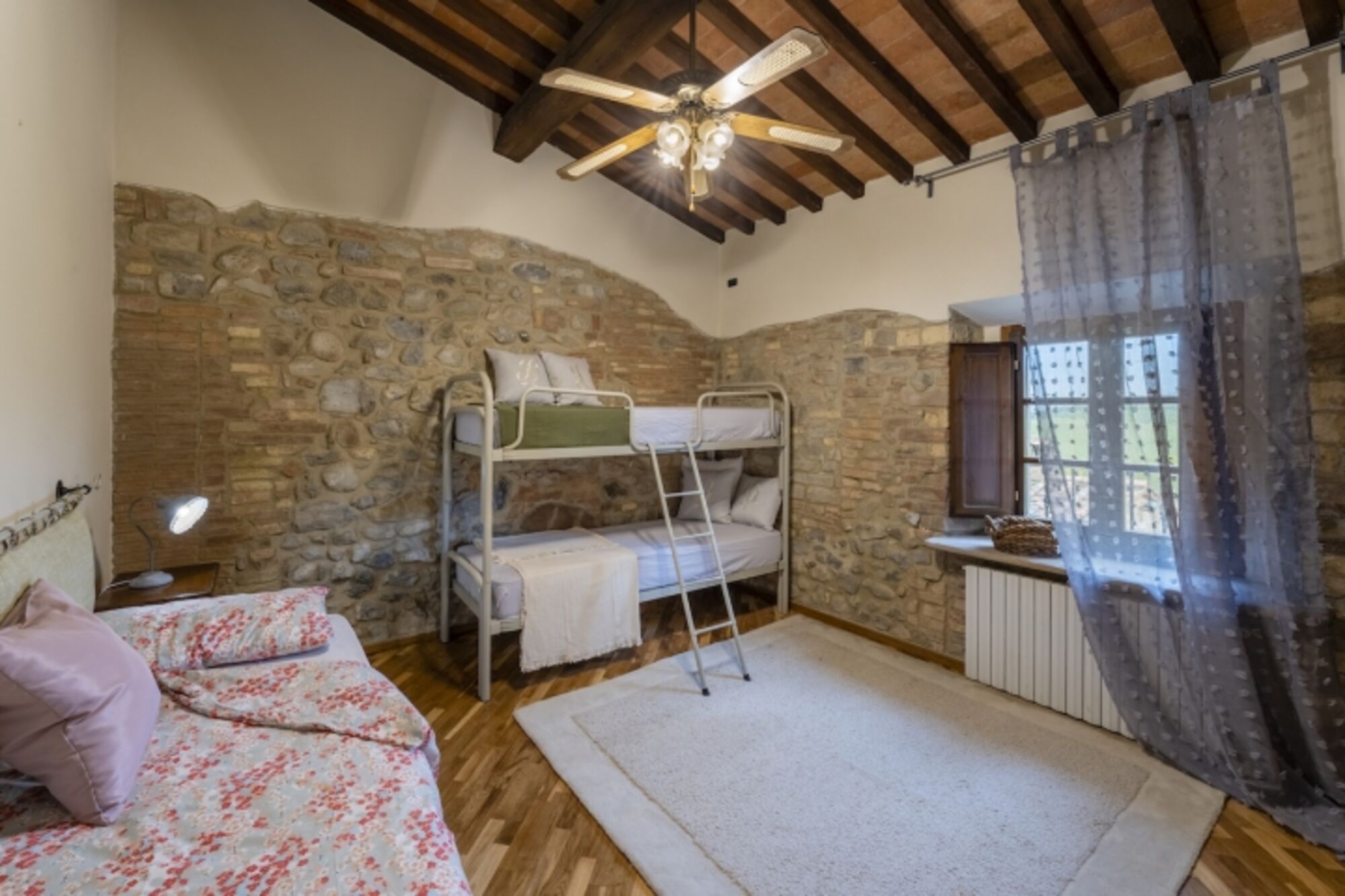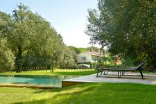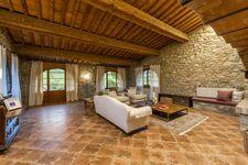 Die Decke verfügt über original Fassbögen. Die großen französischen Fenster blicken auf den Poolbereich, der von beeindruckenden Blumenbeeten umgeben ist, die fachmännisch und geduldig gepflegt wurden. In diesem Außenbereich können die Gäste entspannen und die weichen Hügel im rosa Licht der Morgendämmerung oder die goldenen Strahlen des Sonnenuntergangs bewundern. Auf dieser Ebene befindet sich ein geräumiges Badezimmer mit Dusche.