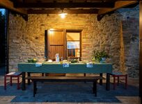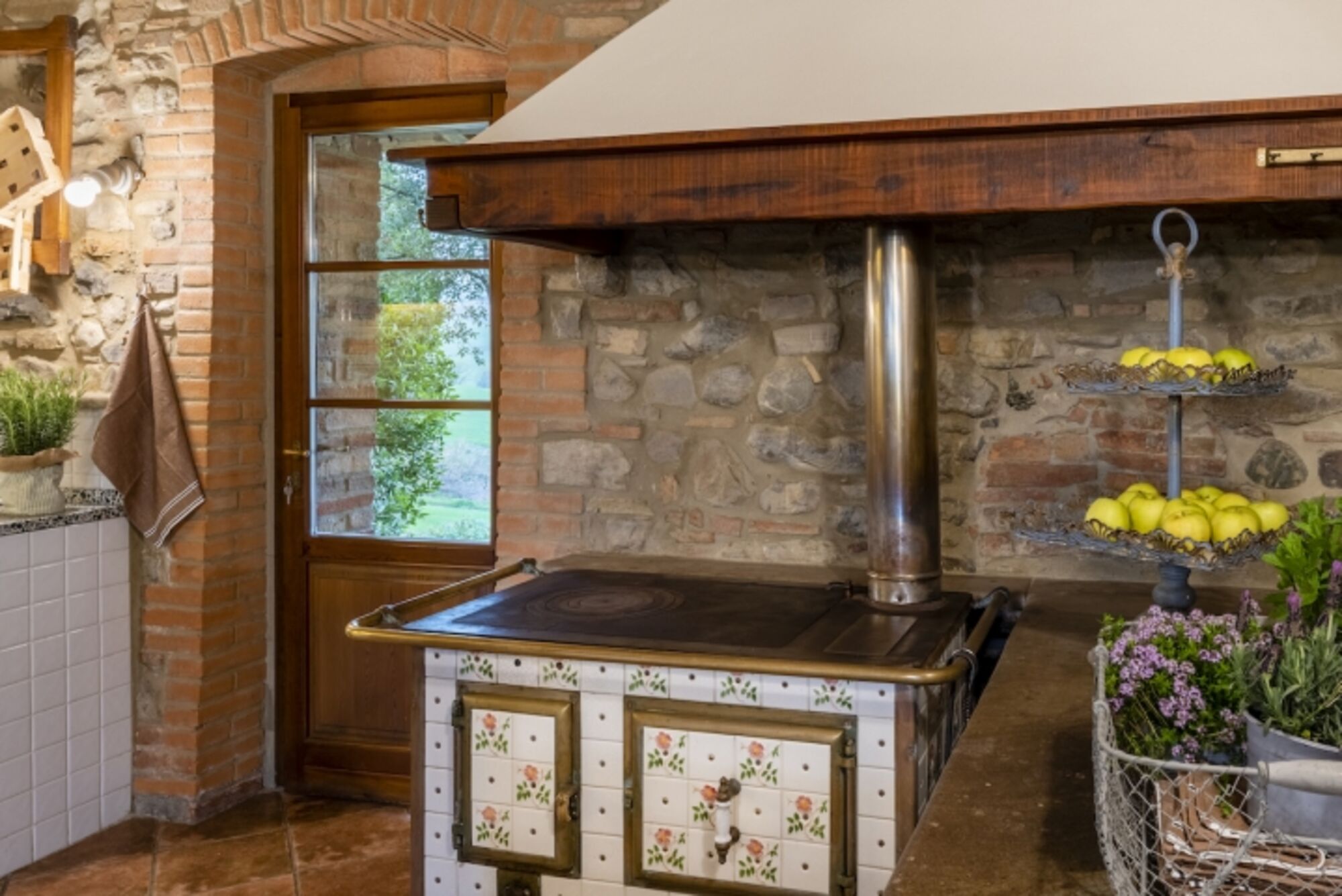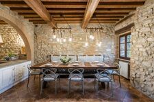 Eine geräumige, voll ausgestattete Küche mit einem klassischen Majolika-Holzofen und einem großen Esstisch. Eine Pergola im Freien ermöglicht es den Gästen, wundervolle Mahlzeiten im Freien mit einem atemberaubenden Blick auf die Hügel von Chianni zu genießen.