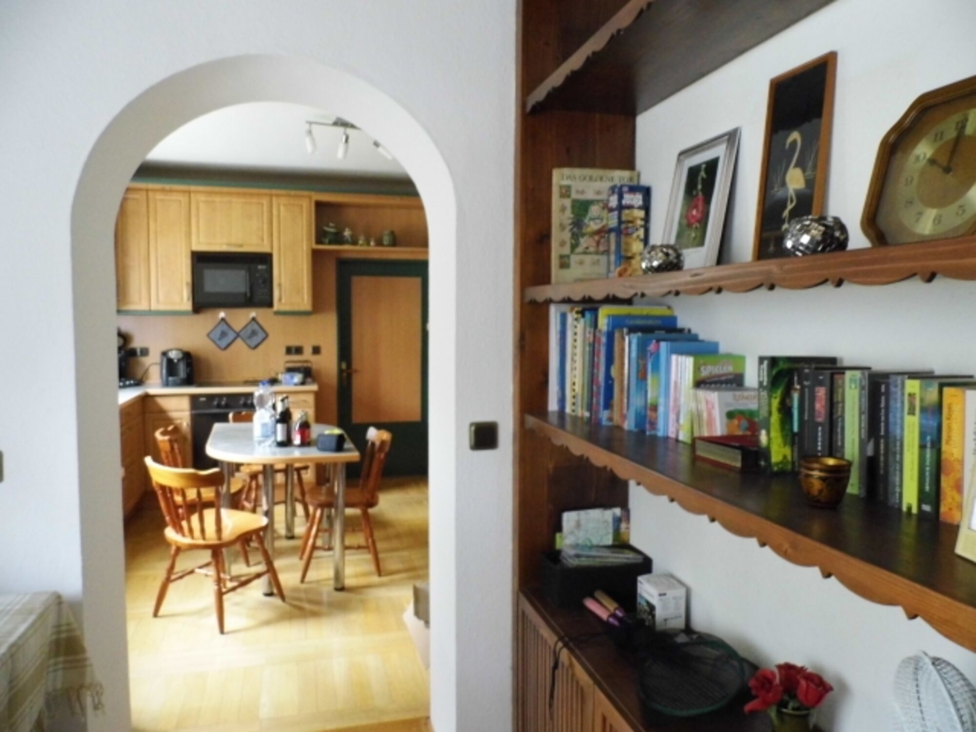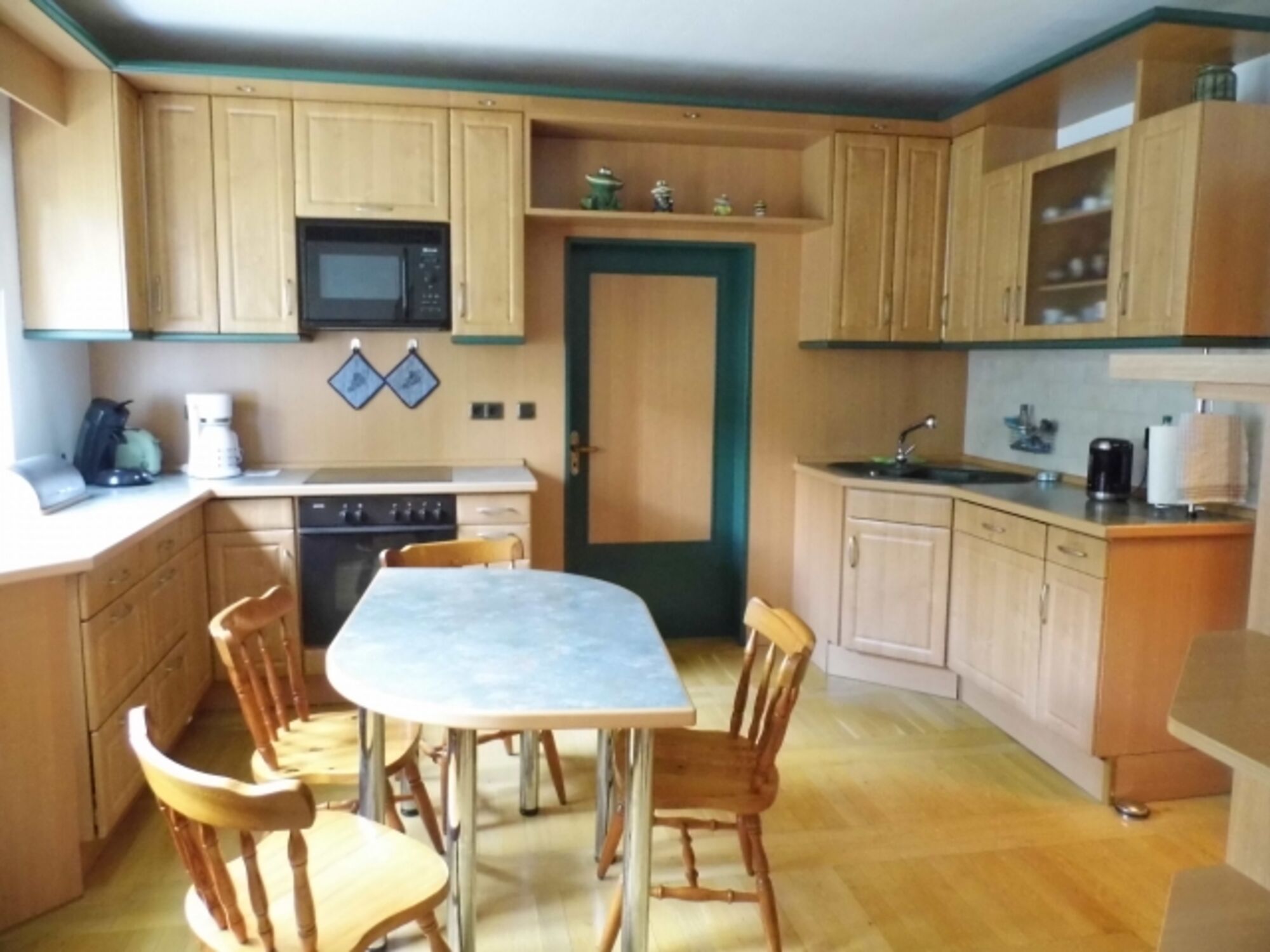 4-Platten Herd, Cerankochfeld, Dunstabzugshaube, Gefrierschrank, Senseo-Kaffeeautomat, Eierkocher, Mixer, Korkenzieher / Flaschenöffner, Gewürze (Salz, Pfeffer, Zucker), Geschirrhandtücher, Mülltüten, Essplatz in der Küche