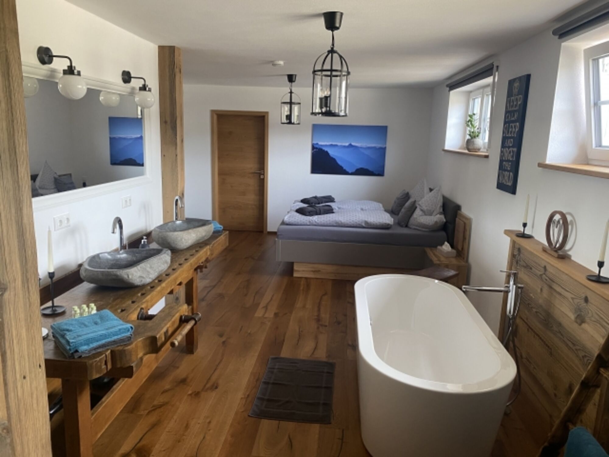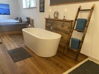 Das Ferienhaus ist modern und offen gestaltet. So ist speziell der Masterbedroom mit offenem Luxusbad eines der Highlights des Ferienhauses. Die freihstehende Badewanne, die Regendusche und der SmartTV geben diesem großen, offenen Raum eine harmonische Einheit. Separates Ankleidezimmer.