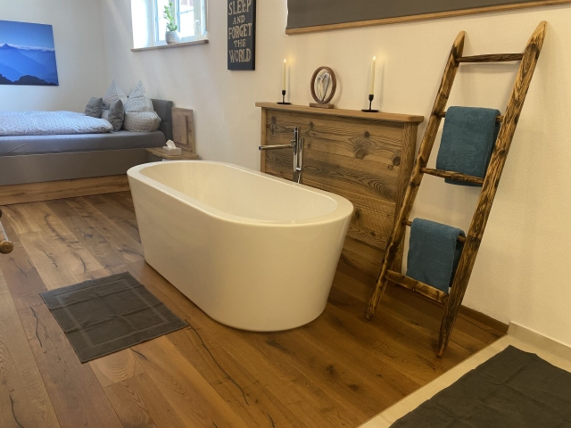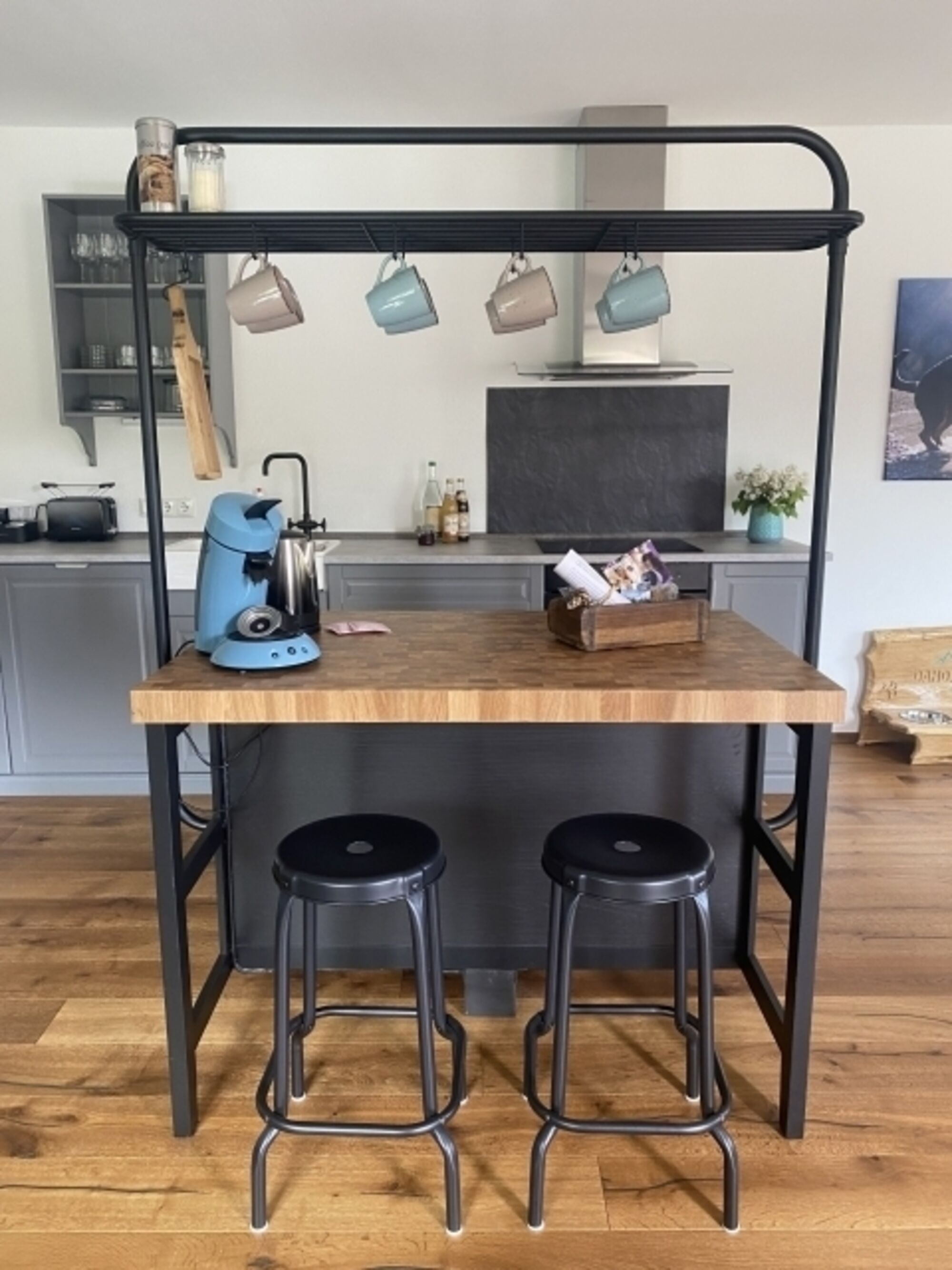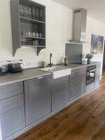 Eichenholzboden mit Fußbodenheizung bringen in Verbindung mit ausgewählten Einzelstücken aus Altholz eine Wohlfühlatmosphäre mit viel Charme ins Haus. Die Küche ist voll ausgestattet und offen zum Wohn-/Essbereich mit insgesamt 55qm.