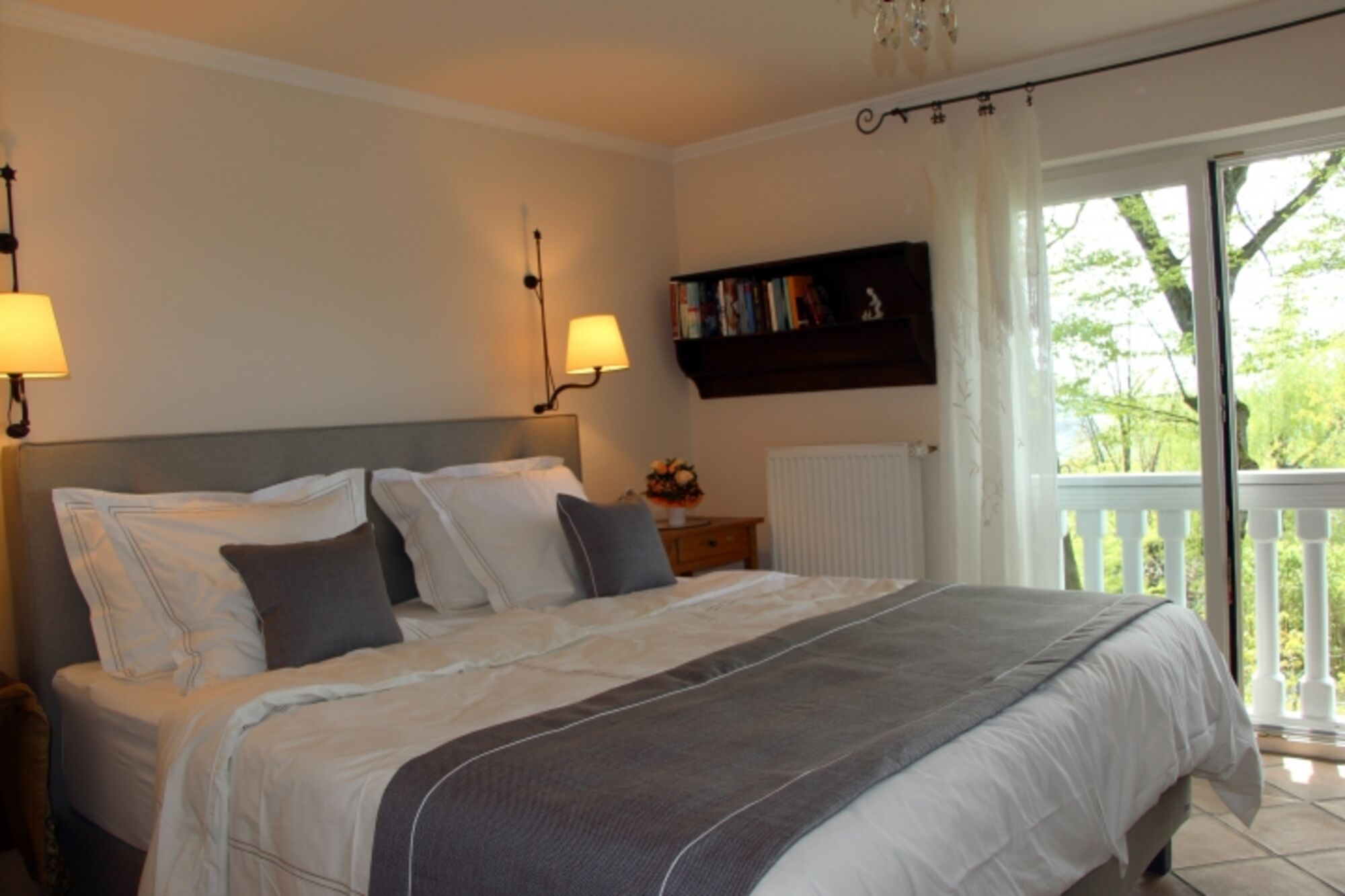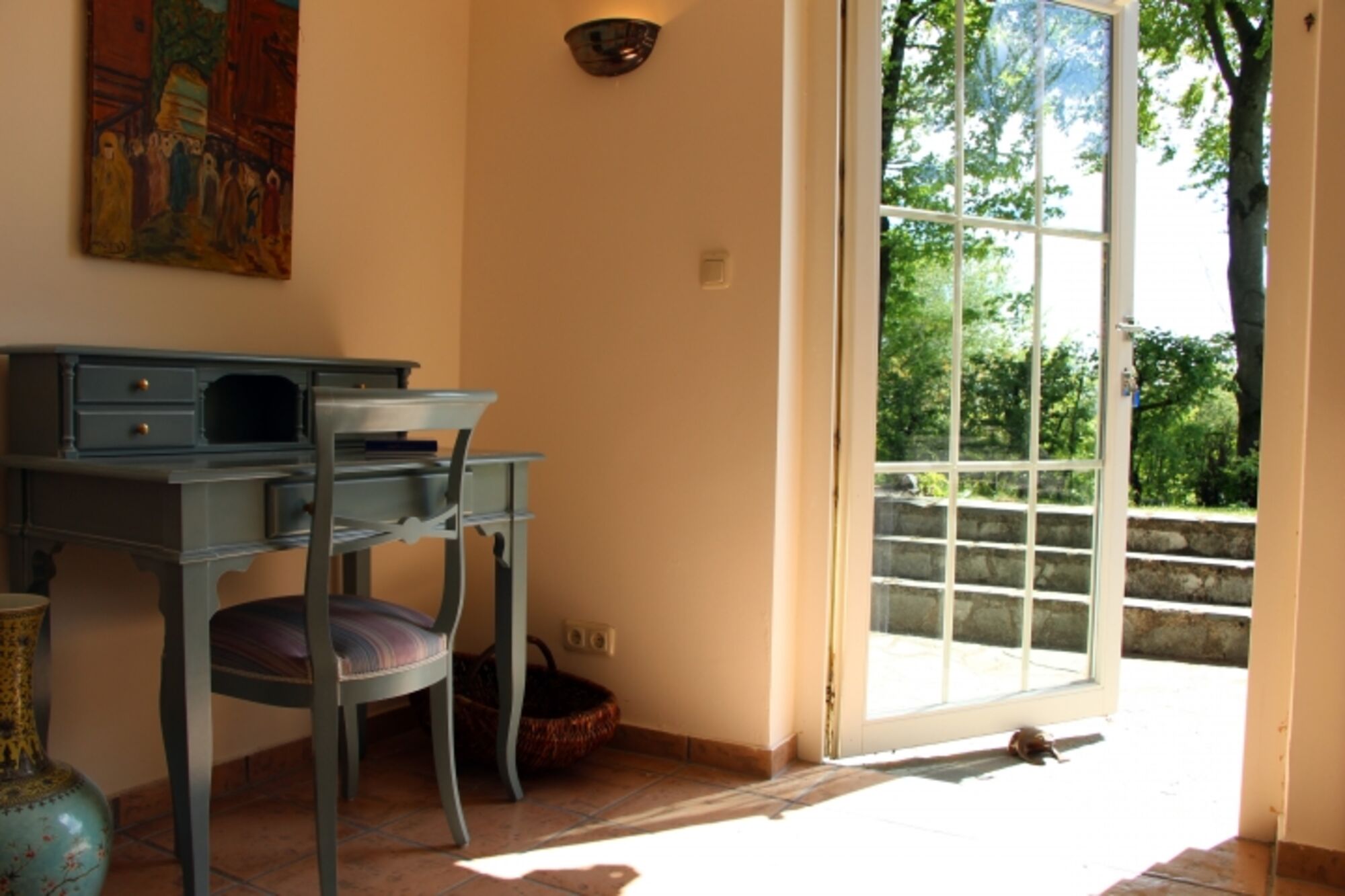 Das Gartengeschoss unterteilt sich ebenso in verschiedene Bereiche. Im Ostflügel gelangen Sie in ein Lesezimmer, weiter in ein romantisches Schlafzimmer mit einem französischen Metallbett und einem Zugang zur Terrasse sowie einem Bad mit einer Badewanne. Im Westflügel befindet sich ein Schlafzimmer und ein Bad mit einer Dusche sowie eine finnische Sauna. Aus diesem Schlafzimmer kann man direkt durch eine Terassentür den Garten erreichen.