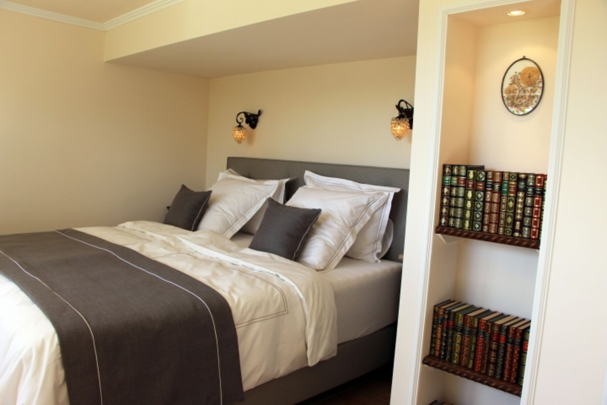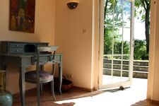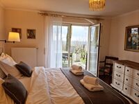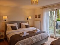 Das romantische Schlafzimmer mit Boxspringbett (180x200cm) verfügt über ein eigenes Bad mit einer Badewanne, eingebauten Kleiderschrank und Ausgang zur eigenen Terasse mit Gartentisch und Stühlen. Das Bett ist mit einem hochwertigen Geltopper ausgestattet. Neben diesem Schlafzimmer befindet sich ein zweites Wohnzimmer des Hauses mit einer Ledersitzgarnitur, zwei Ohrensesseln und Bücherregal. Doppelbett 1,80 x 2,00m, Spiegel, Leselampe am Bett