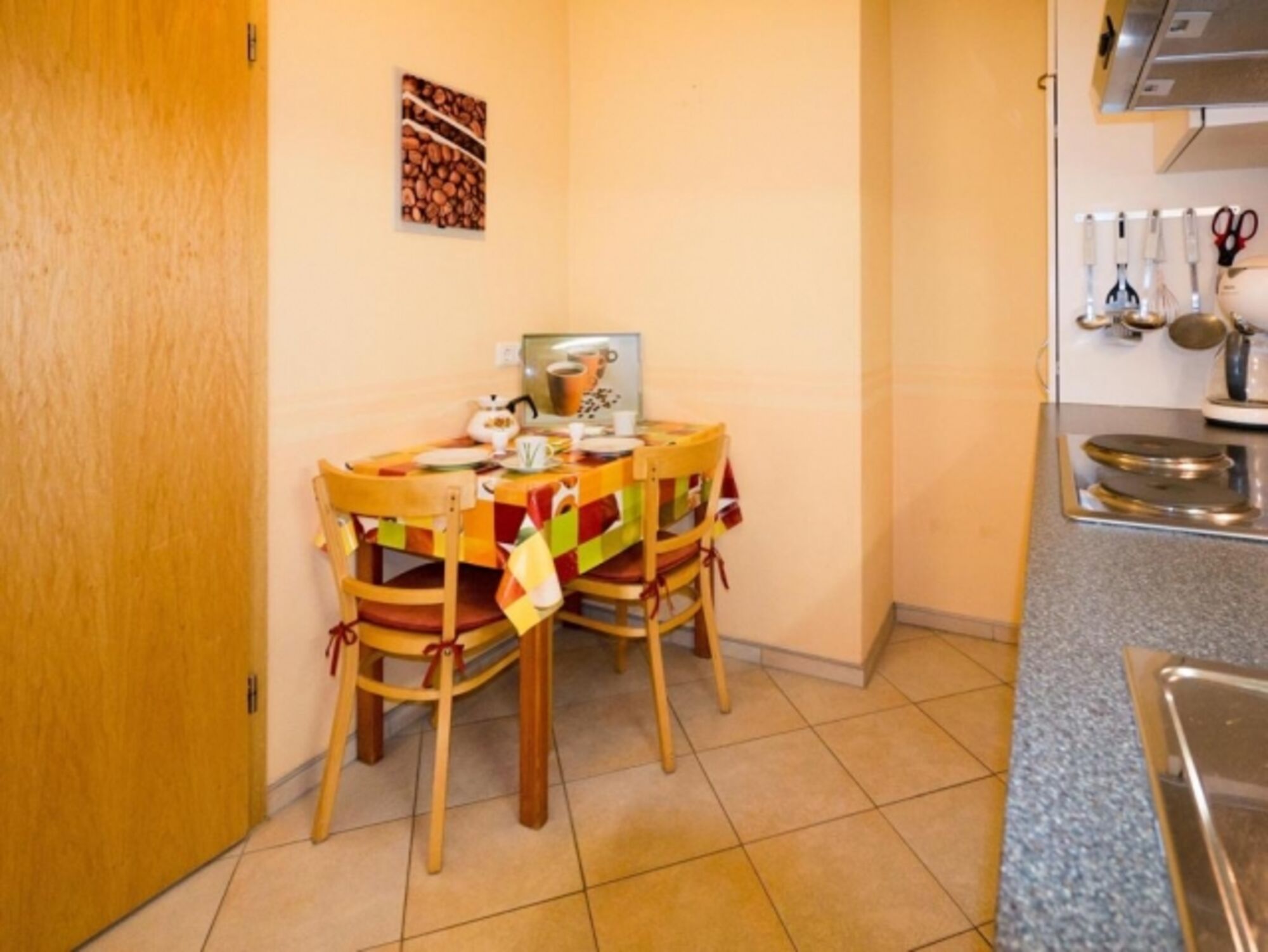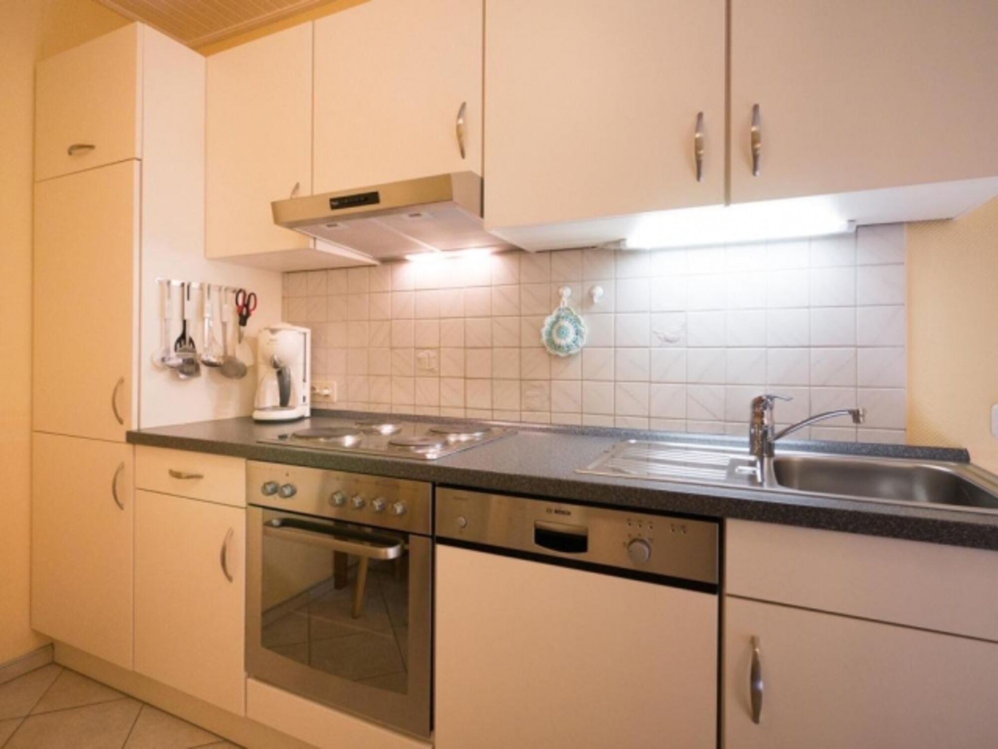 4-Platten Herd, Cerankochfeld, Dunstabzugshaube, Kühlschrank mit Gefrierfach, Korkenzieher / Flaschenöffner, Mülltüten, Essplatz in der Küche