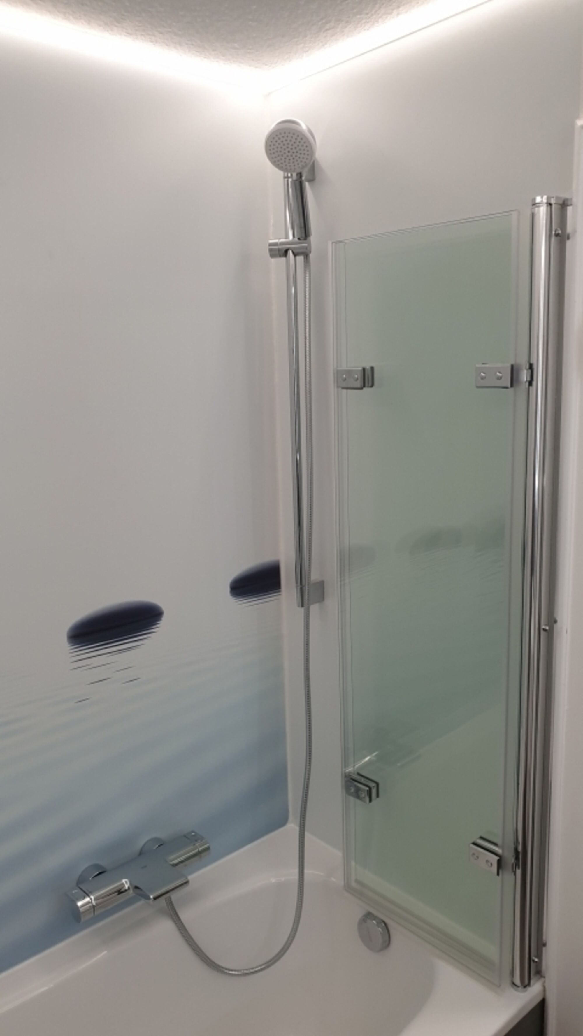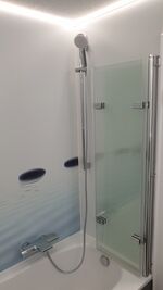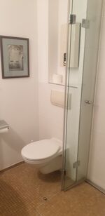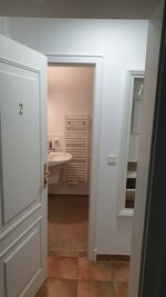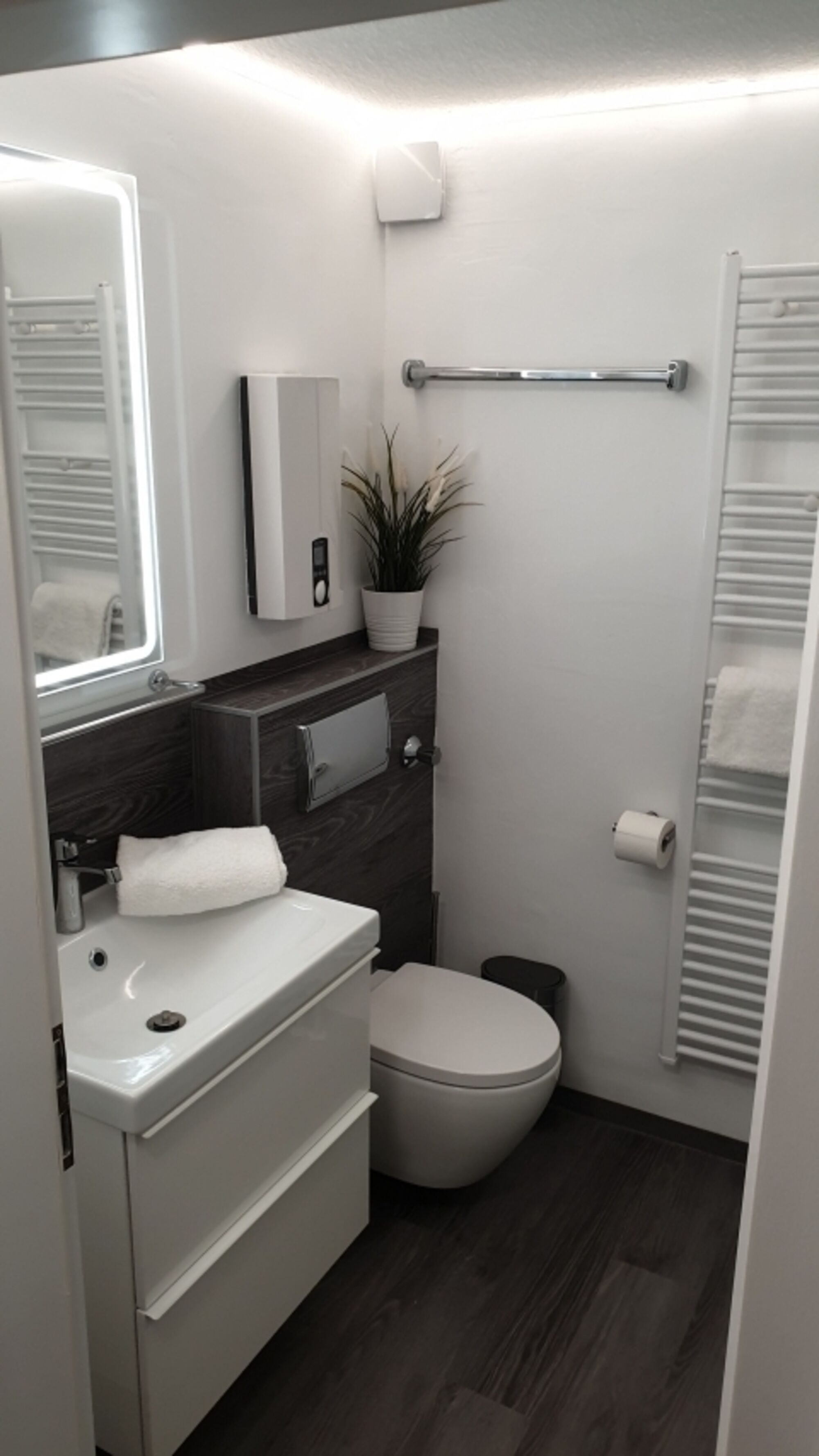Das Bad mit WC befindet sich im Untergeschoss und bietet viele Ablagemöglichkeiten. Zusätzlich befindet sich eine bodenebene Dusche mit WC im Erdgeschoß. Ebenso jeweils einem Fön