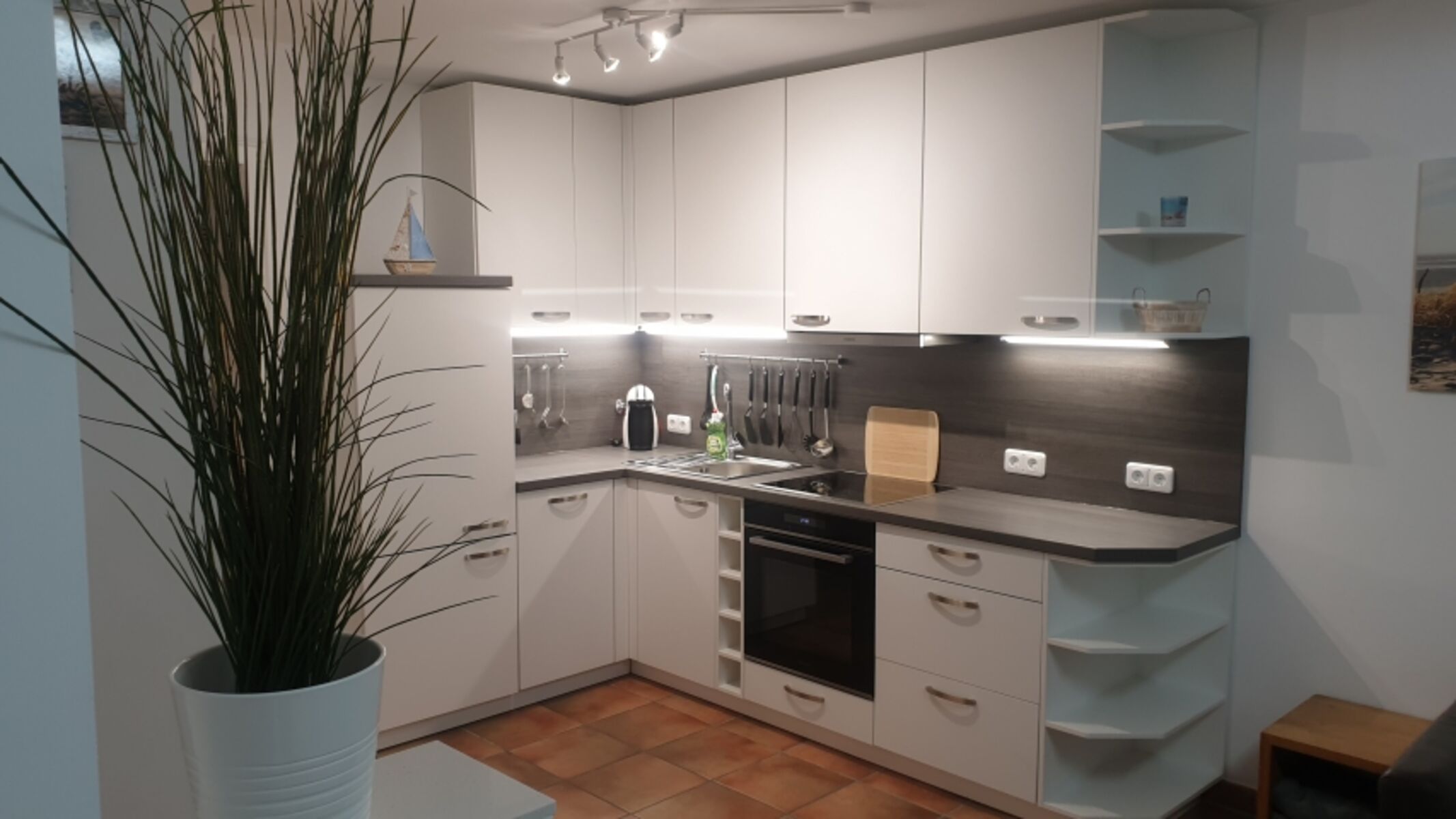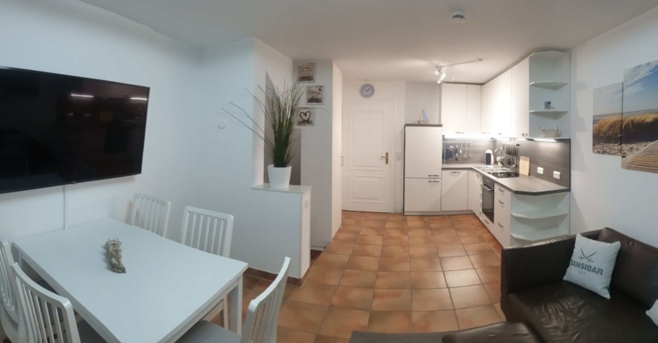 Die helle Küchenzeile bietet genügend Arbeitsfläche, um kulinarische Köstlichkeiten zuzubereiten. Zur Ausstattung gehören ein Ceran-Kochfeld, eine Espressomaschine, ein Geschirrspüler und weitere Annehmlichkeiten. Am Esstisch finden vier Urlaubsgäste genug Platz, um gemeinsam zu speisen.