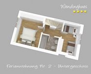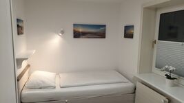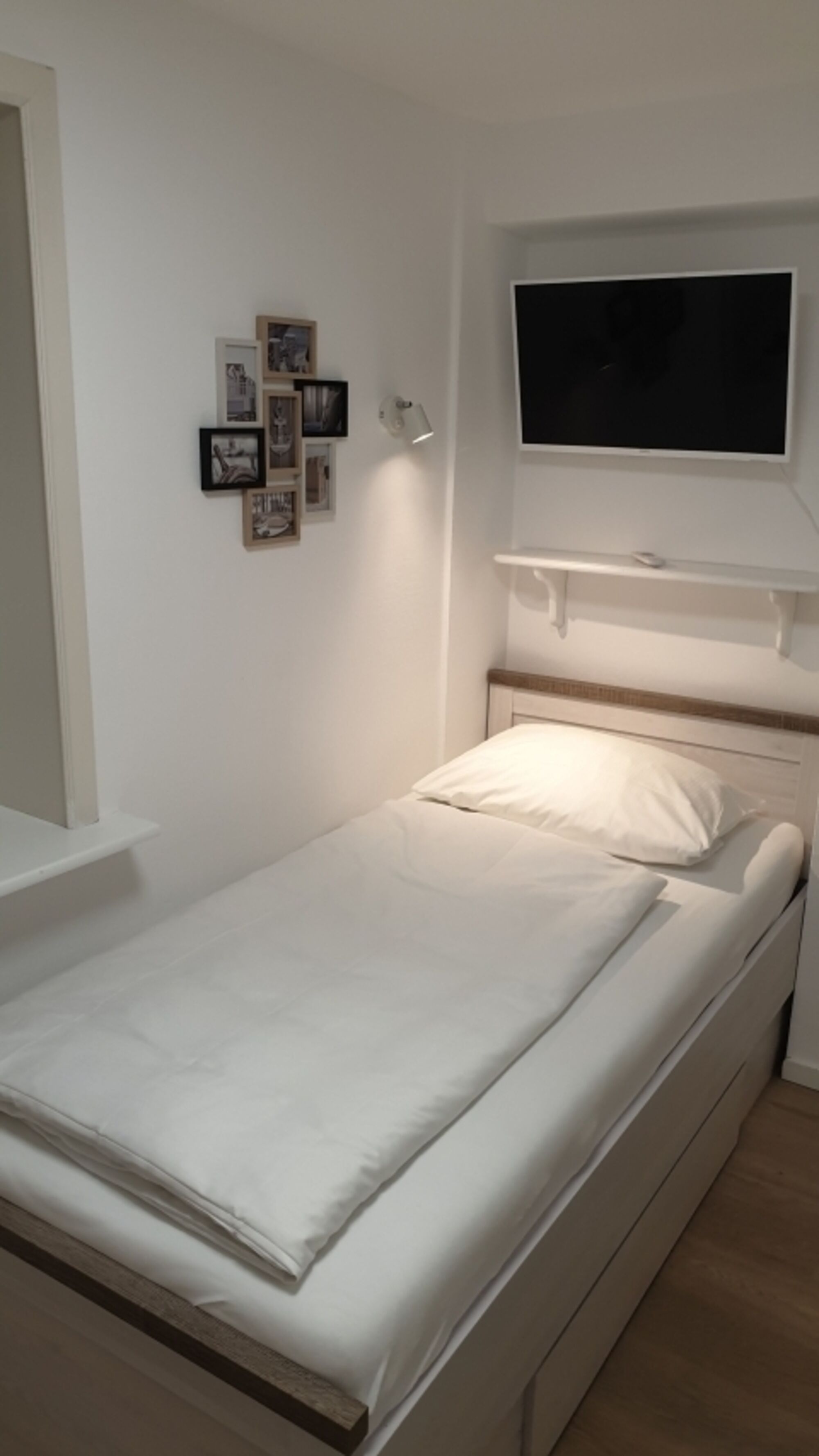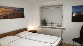Die Schlafzimmer der Ferienwohnung befinden sich im Untergeschoss des Hauses. Schlafzimmer 1 ist mit einem großen Doppelbett und im Schrank eingebauten TV ausgestattet. Schlafzimmer 2 verfügt über zwei bequeme Einzelbetten. Jeweils mit großen Einbauschränken.