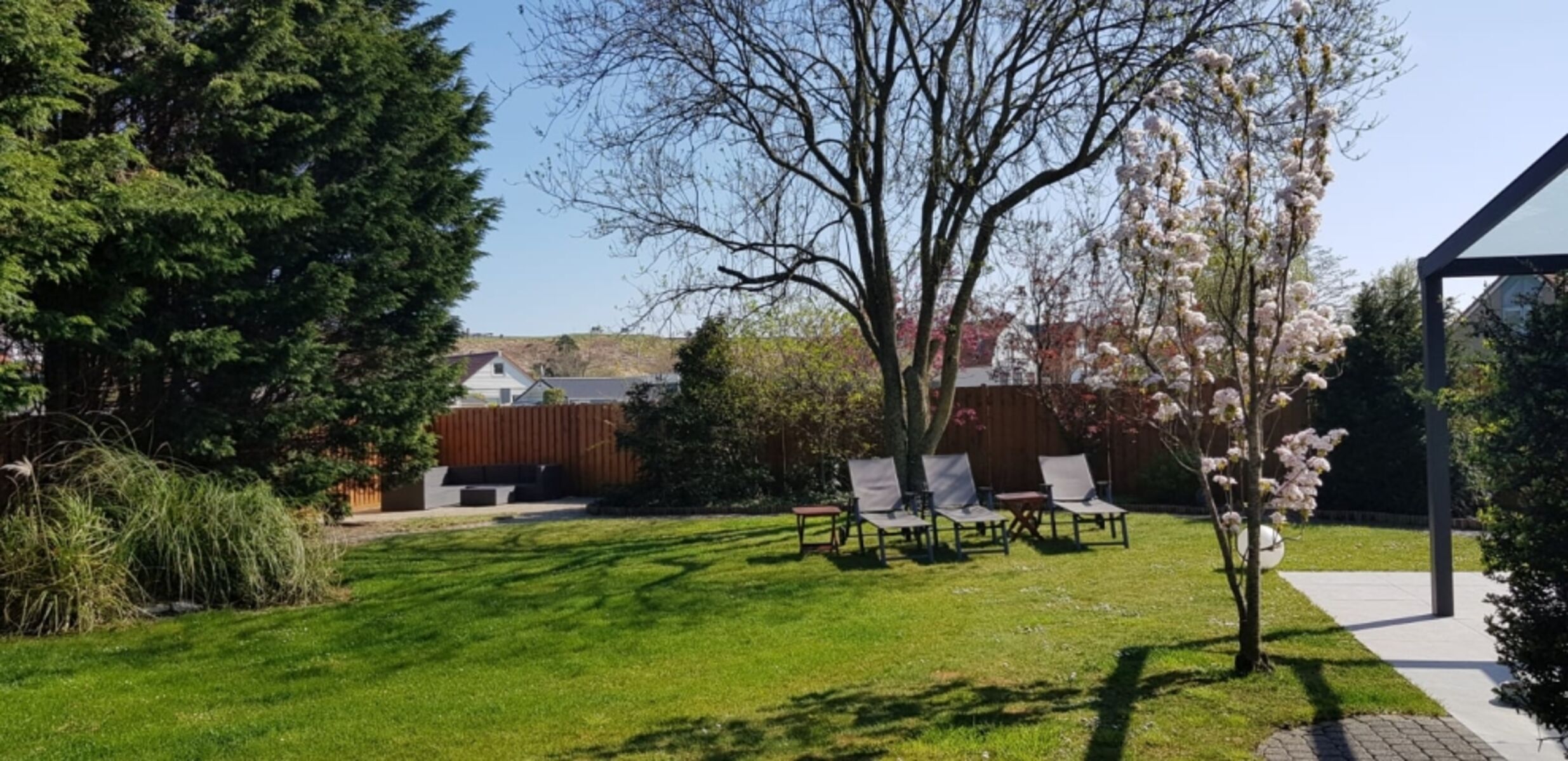 Die große Gartenanlage auf dem 750 m² großen Grundstück mit ihren drei Terrassen wartet auf Sie. Dort haben Sie Ihre Privatsphäre und nach Wunsch Sonne oder einen schattigen Platz unter dem alten Baumbestand. Durch den privaten Gartenausgang sind Sie in fünf Minuten am Strand. Sie können das Meer riechen und schmecken, so nah ist es.