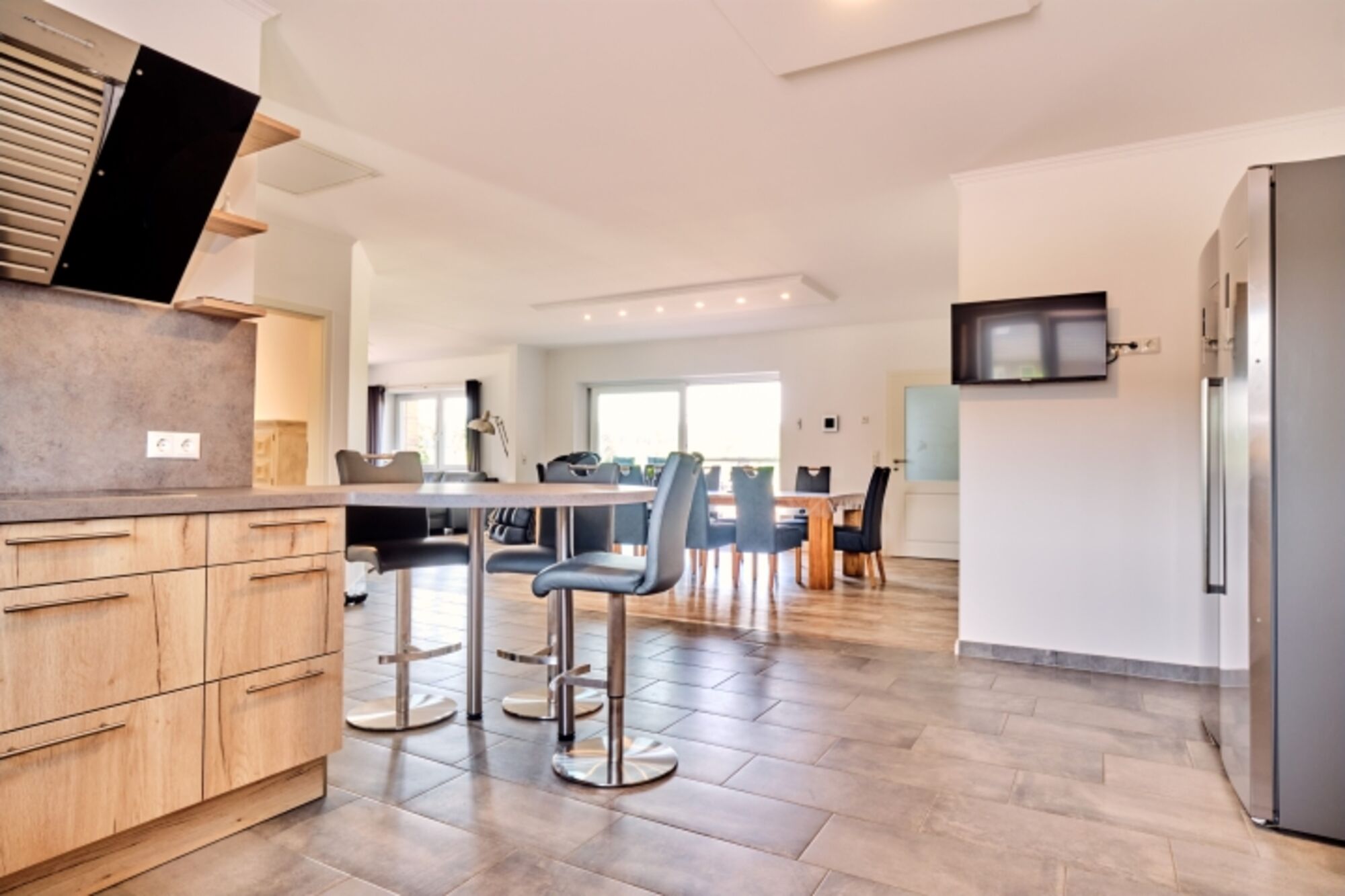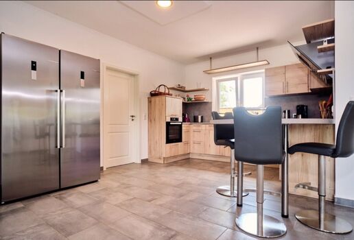 Die komplett eingerichtete Einbauküche enthält moderne Geräte: Geschirrspüler, Mikrowelle, Herd, Kühlschrank und Gefrierschrank sind eine Selbstverständlichkeit. Das komplette Haus ist mit einer Fußbodenheizung ausgestattet - mittels Wärmepumpe.